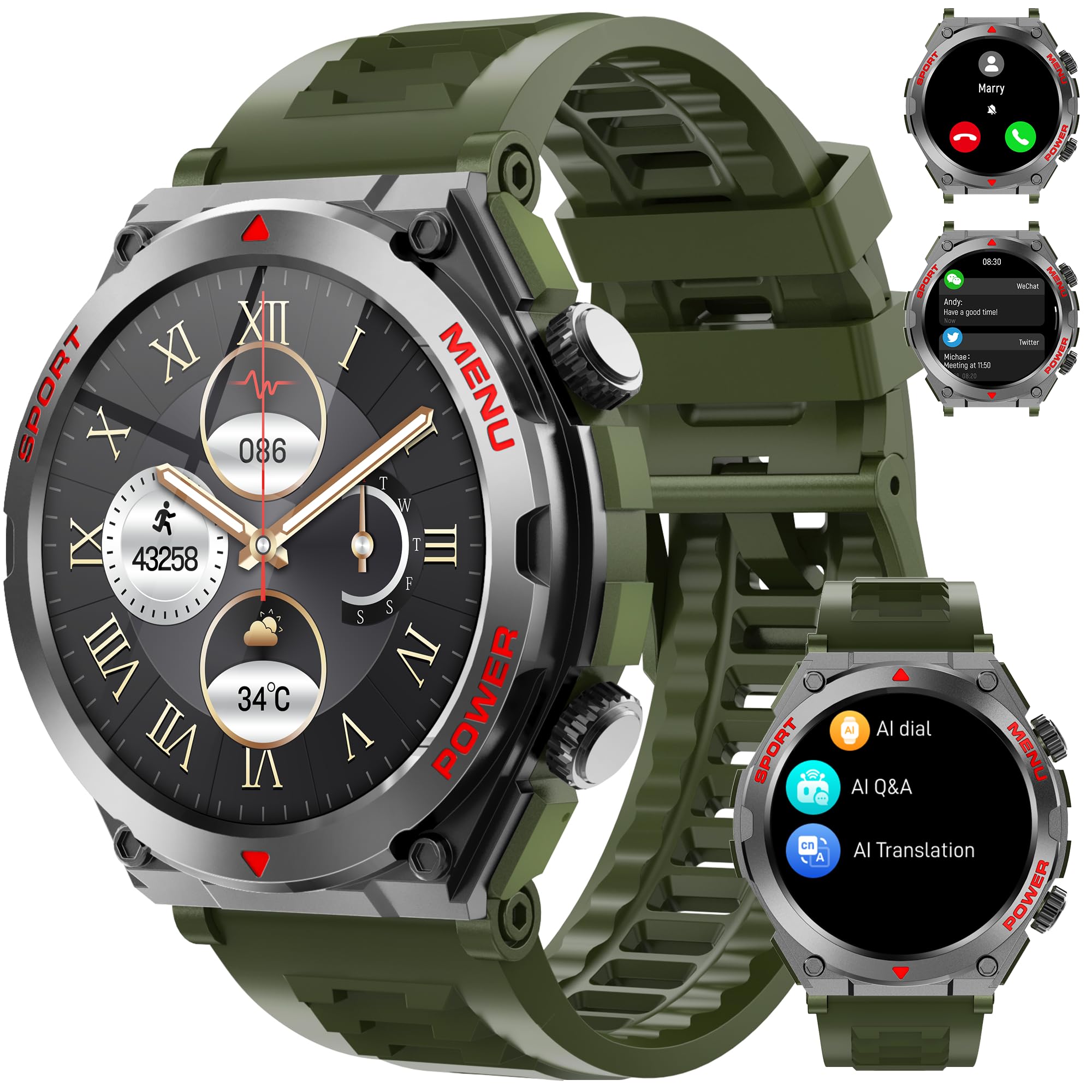 Reloj inteligente militar, reloj inteligente con texto y llamadas, IA integrada, respuesta SMS, frecuencia cardíaca, oxígeno en sa