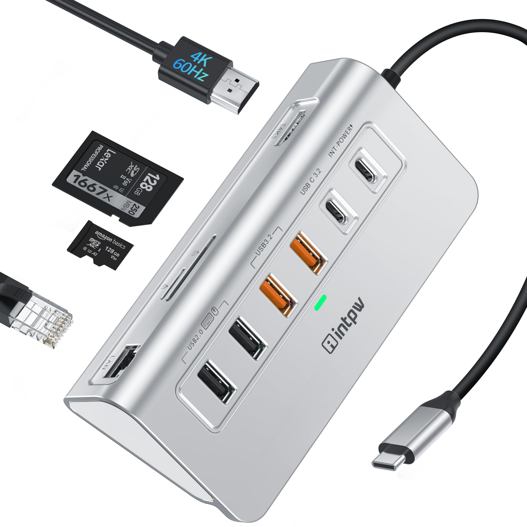 10-in-1 USB-C Hub with 10Gbps Data Transfer, 100W Power Delivery, 4K 60Hz HDMI, SD/TF Card Reader, 7 USB Ports, Gray, 5.2x2x0.75 I
