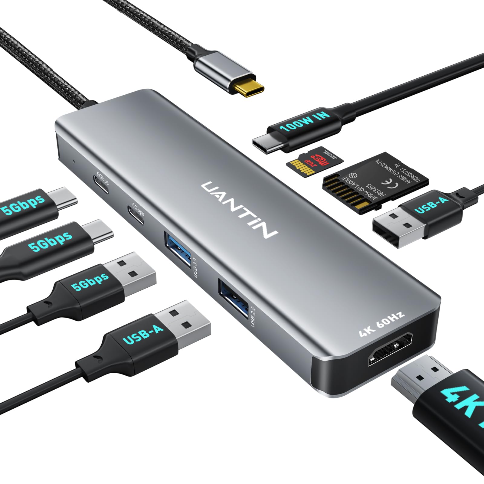 Concentrador USB C 9 en 1, adaptador multipuerto HDMI 4K60Hz con 2 USB-C 5Gbps, carga PD de 100 W, 3 puertos USB-A, lector de tarj