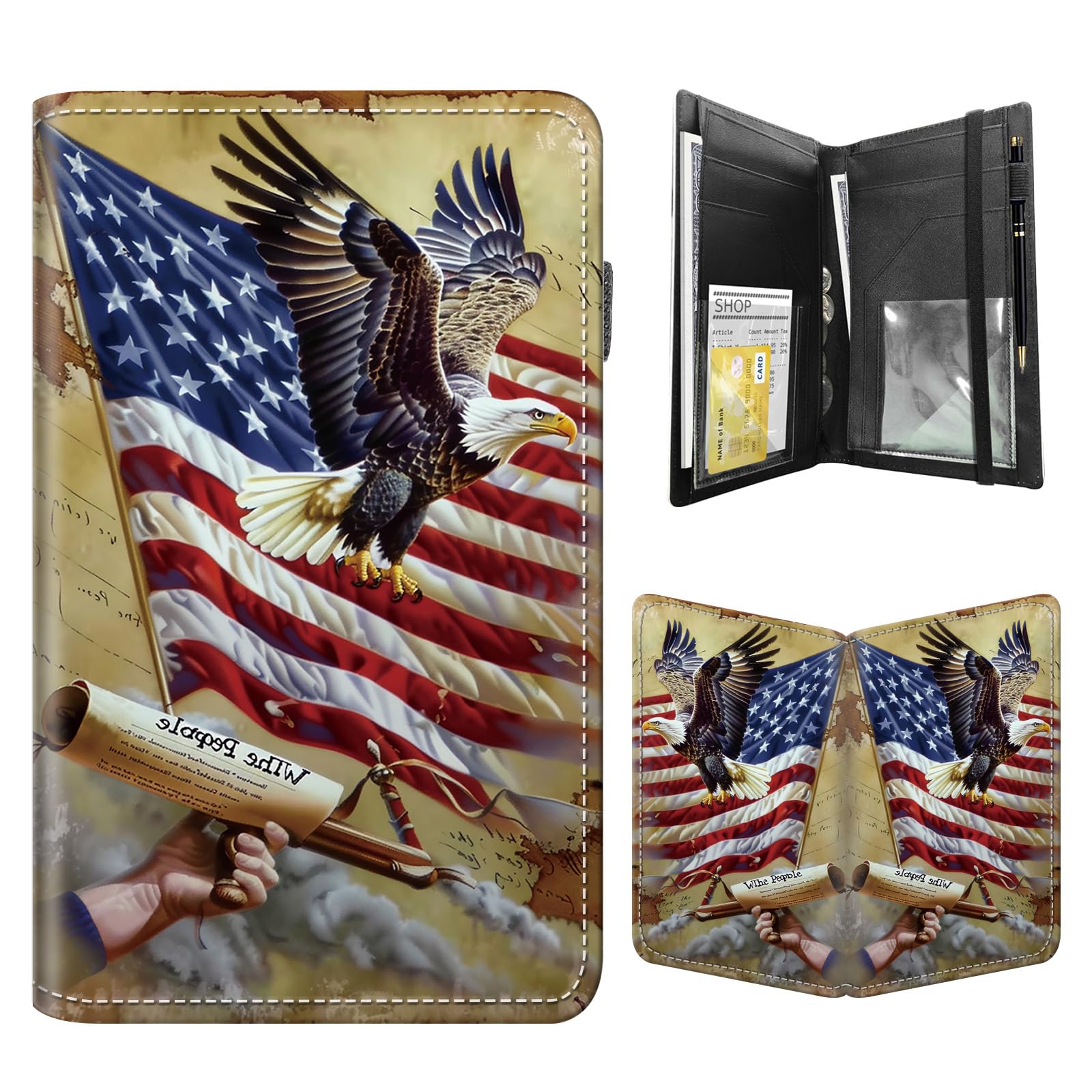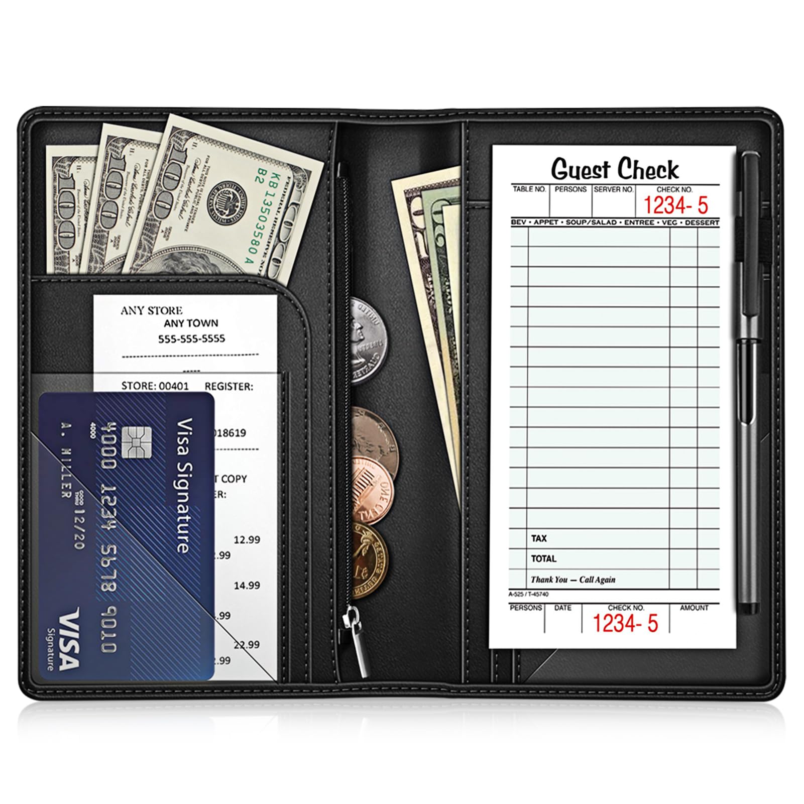 Libros para camarera de 5 x 7.75 pulgadas, libreta negra con bolsillo con cremallera y 5 bolsillos grandes, 1 soporte para bolígra
