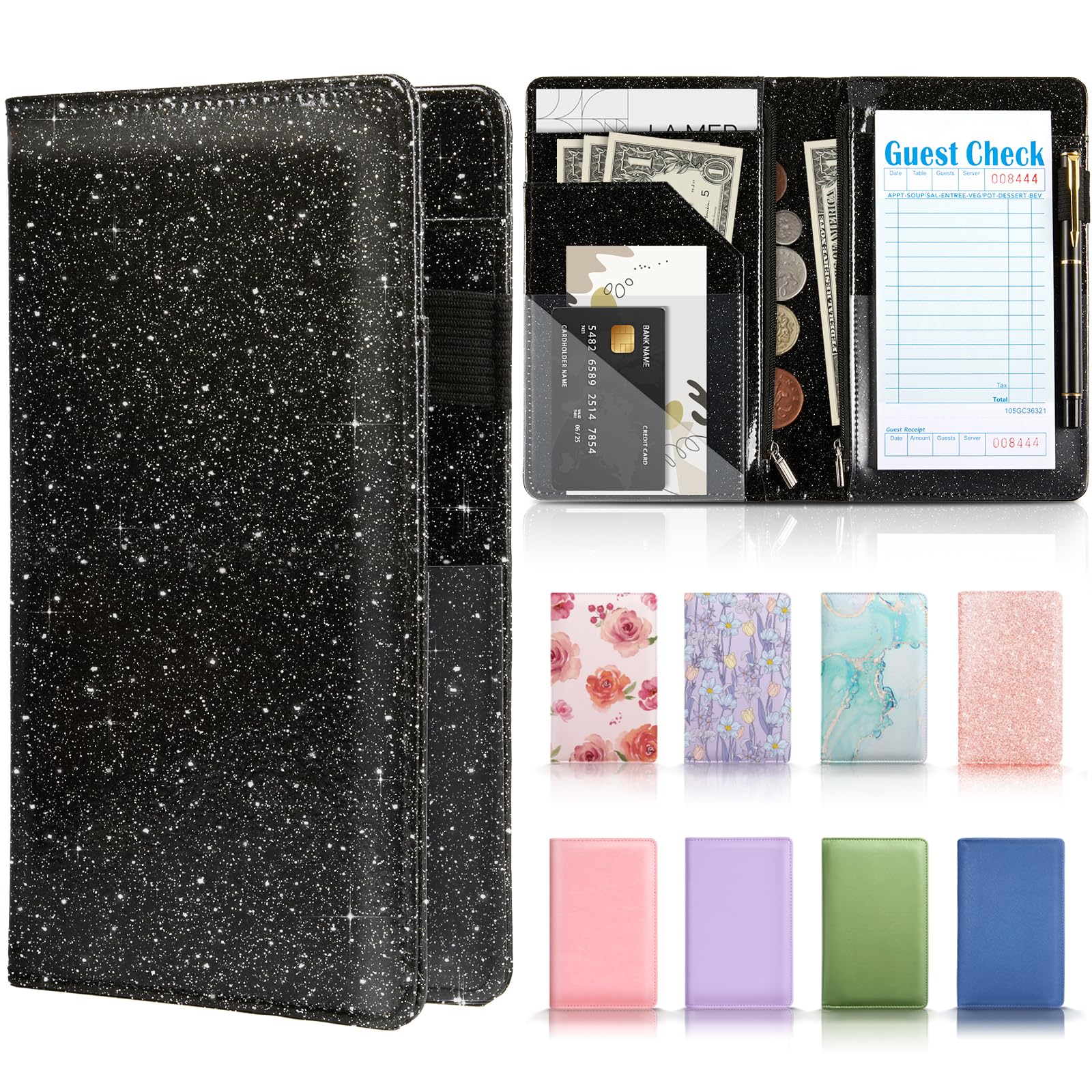 Waiter Book Server Wallet-7.7 x 5″ PU Leather Waitress Book with Zipper,Check Holder & Money Pockets-Multi-Pocket Organizer for Bi