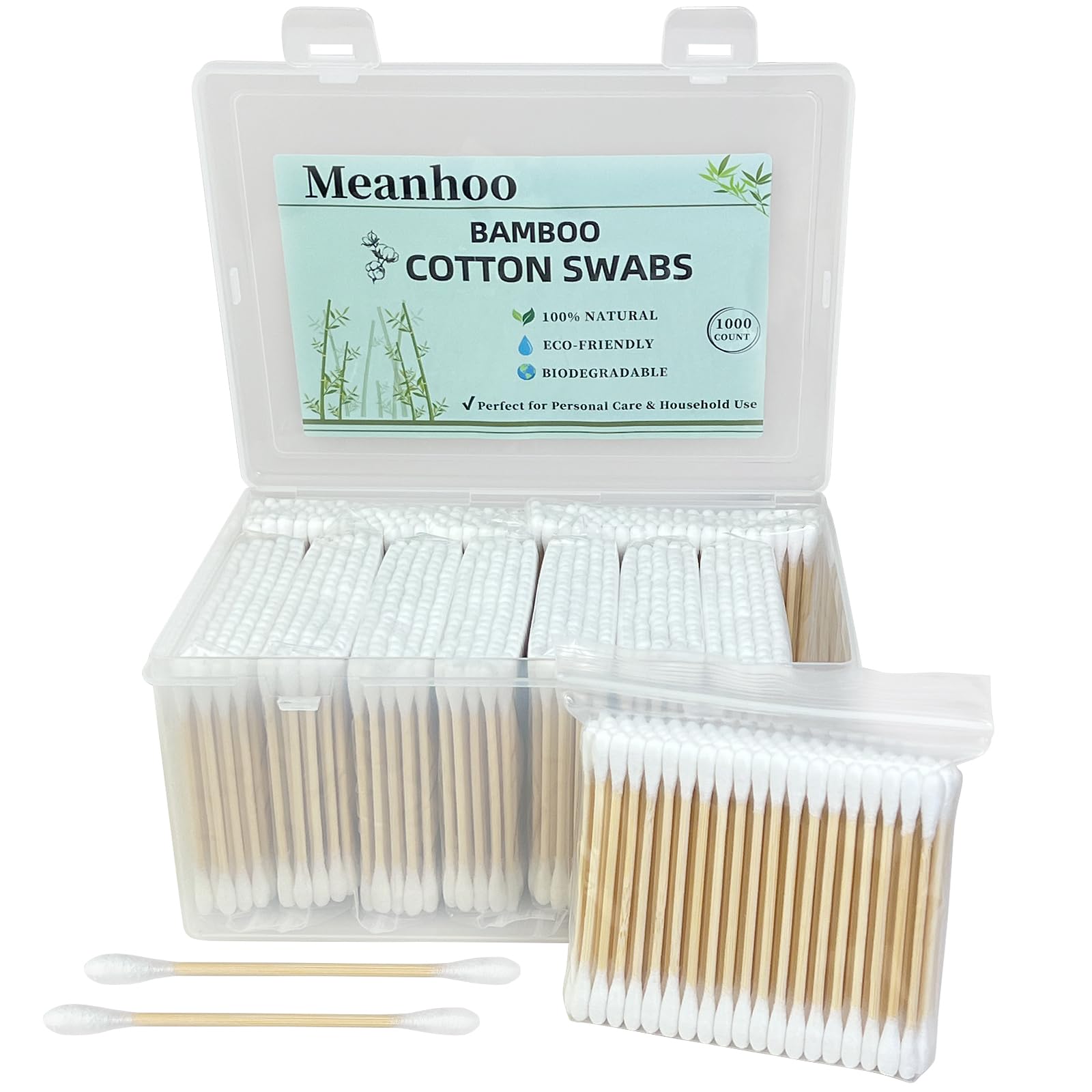 Hisopos de algodón de bambú de 1000 unidades en caja de almacenamiento, cogollos de algodón orgánico de doble punta con palitos de