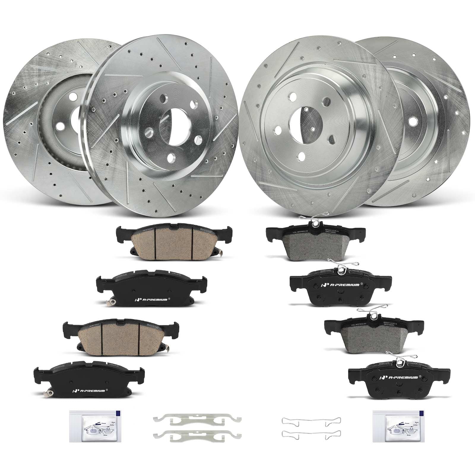 A-Premium Kit de rotores de freno de disco perforados y ranurados delanteros y traseros + pastillas de cerámica compatibles con mo