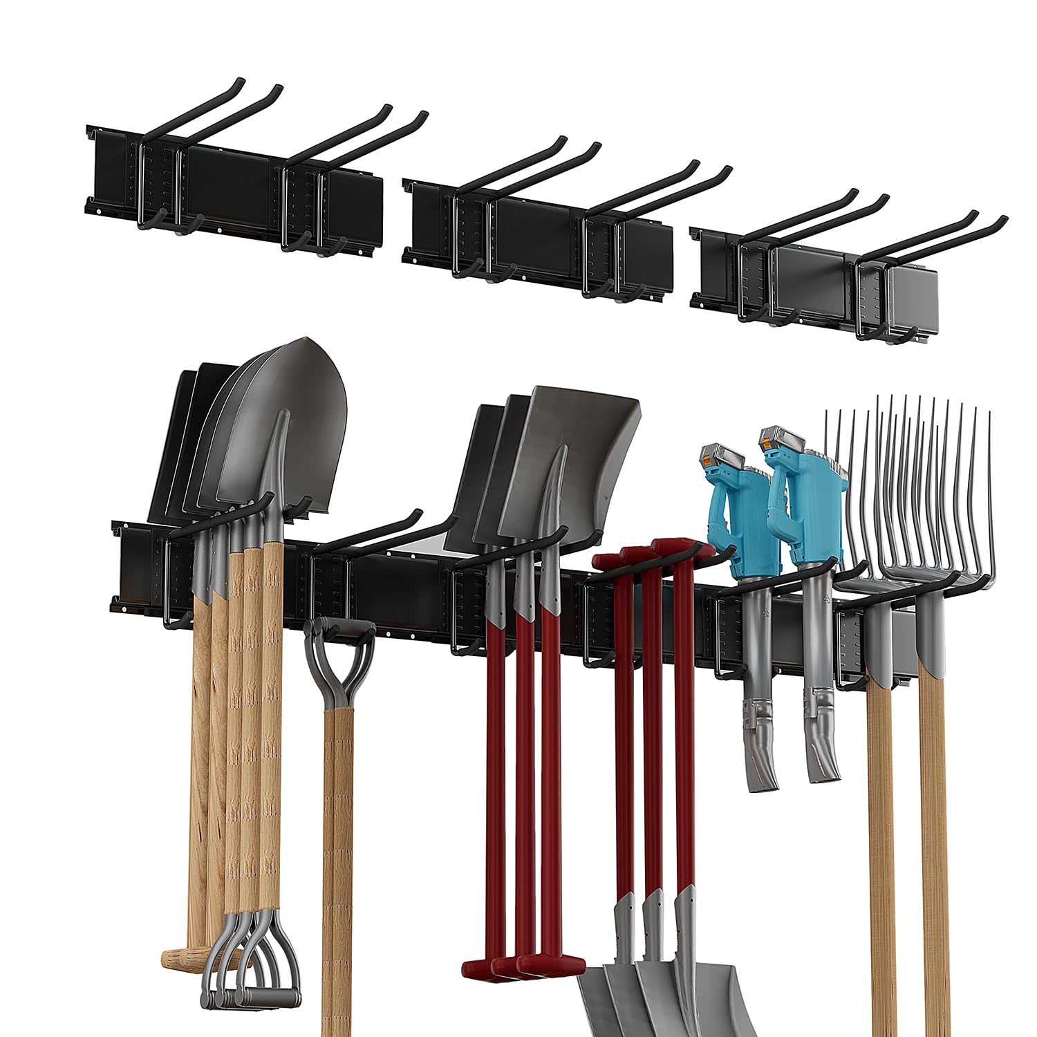 Soporte de pared para herramientas de garaje, soporte de herramientas de jardín resistente de 48 pulgadas con 6 ganchos ajustables