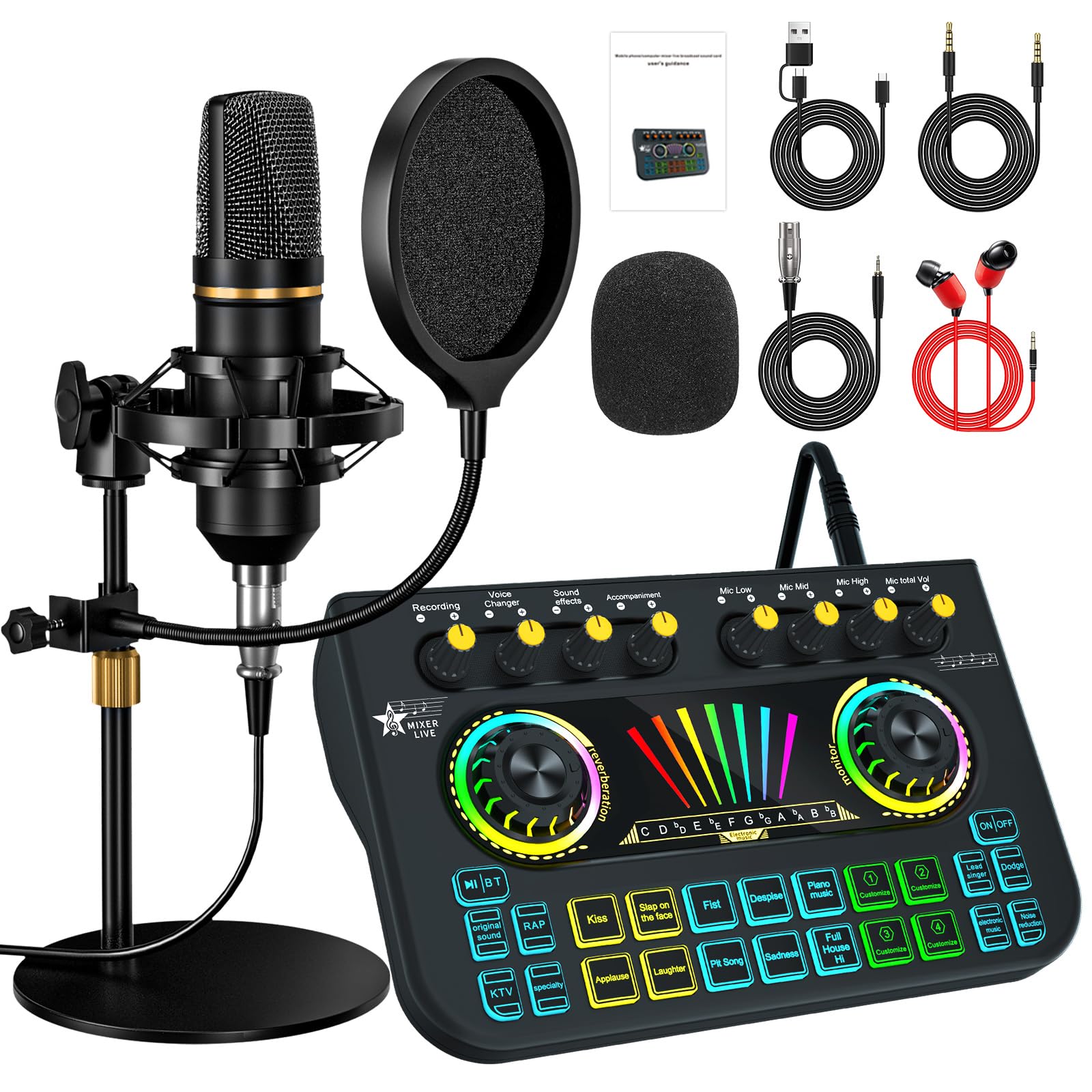 Paquete de equipos de podcast, con mezclador de audio de tarjeta de sonido en vivo, equipado con micrófono de 0.138 in, paquete de