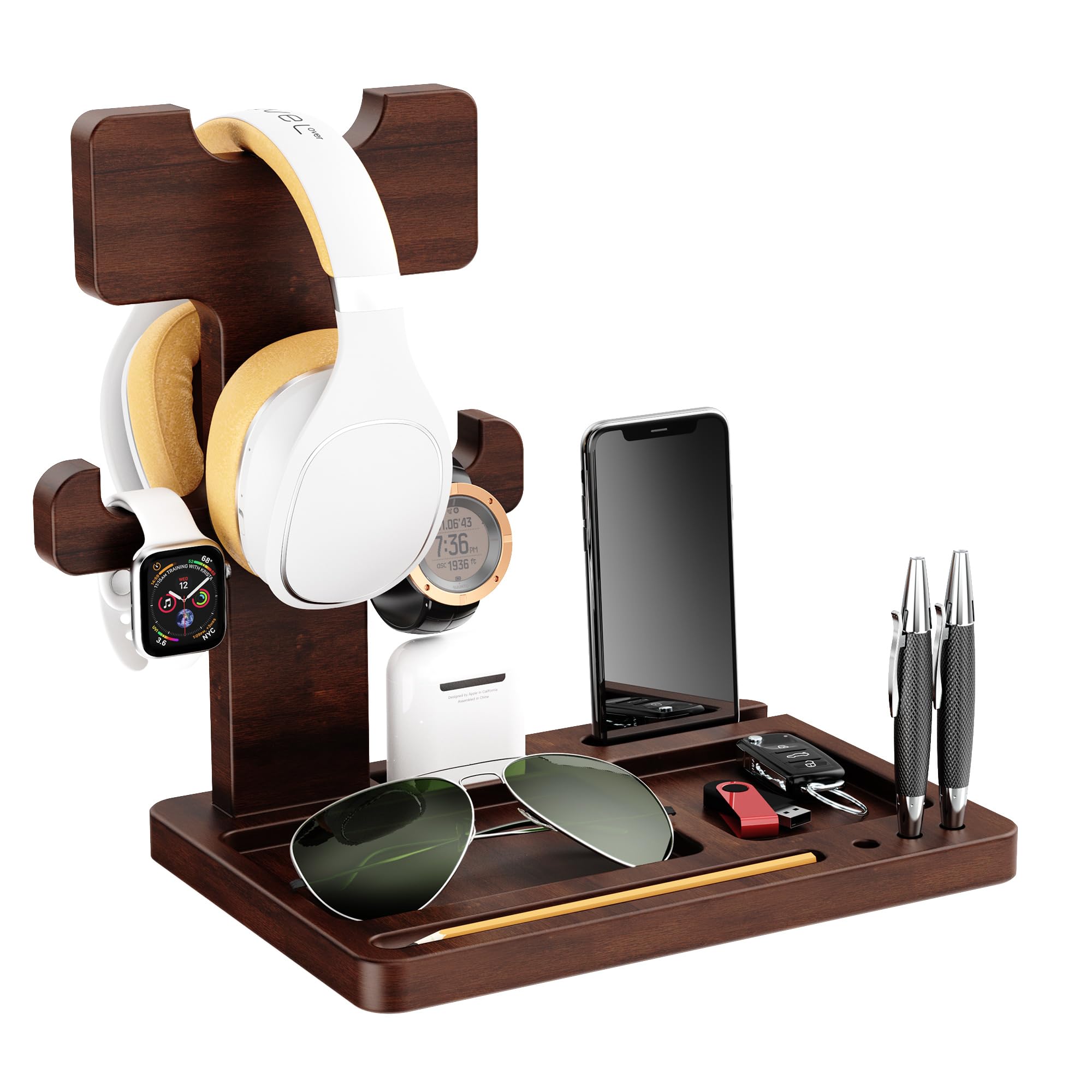 Soporte de madera para auriculares para escritorio, soporte de auriculares para juegos, soporte para auriculares con bandeja de al