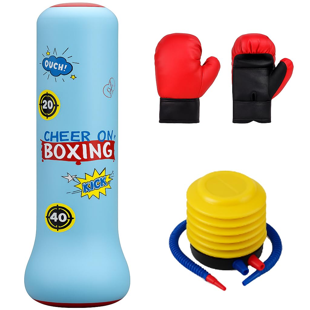 1.6FT Inflatable Kids Punching Bag Set – Includes Air Pump & Boxing Gloves – Blue Freestanding Punching Toy for Boys & Girls Ages