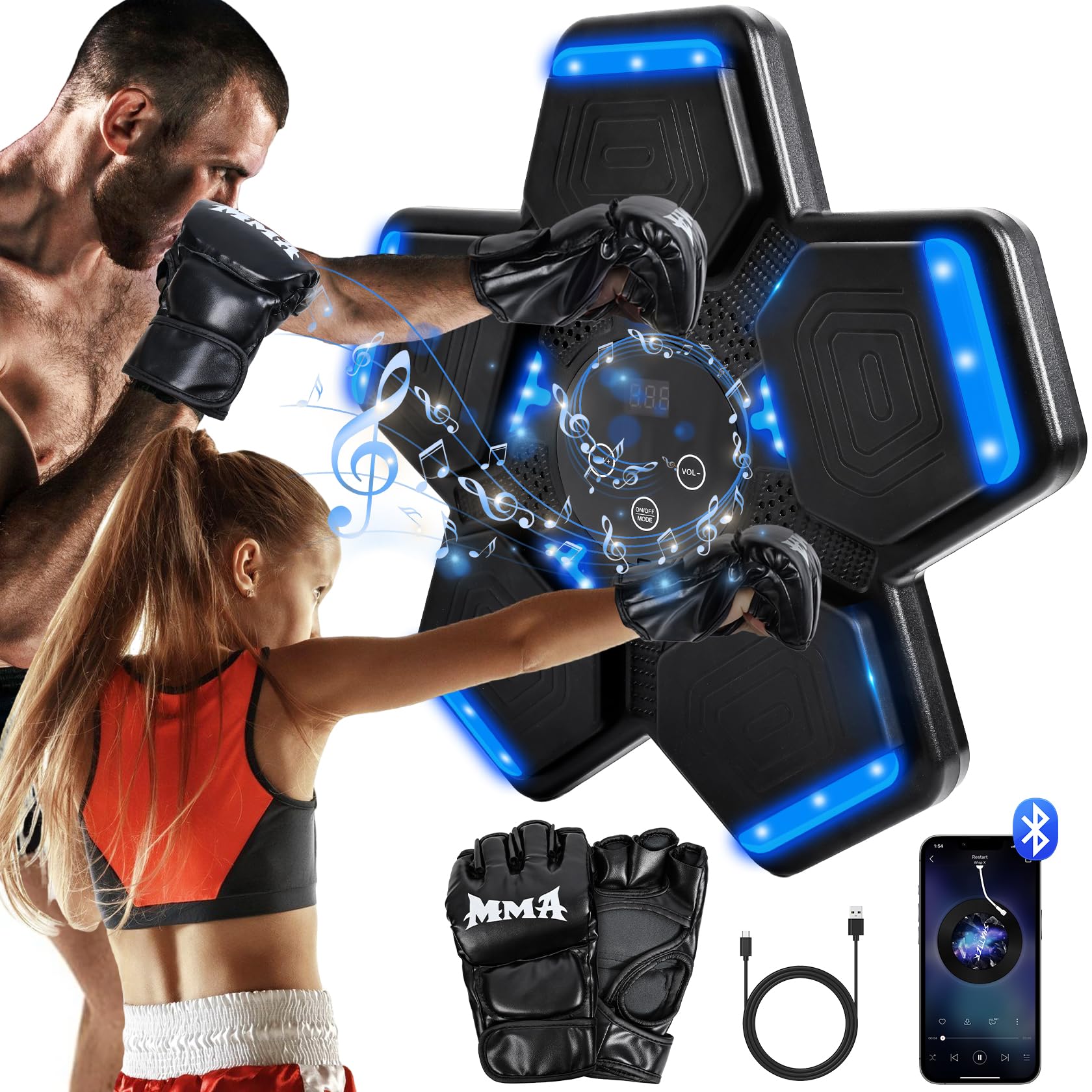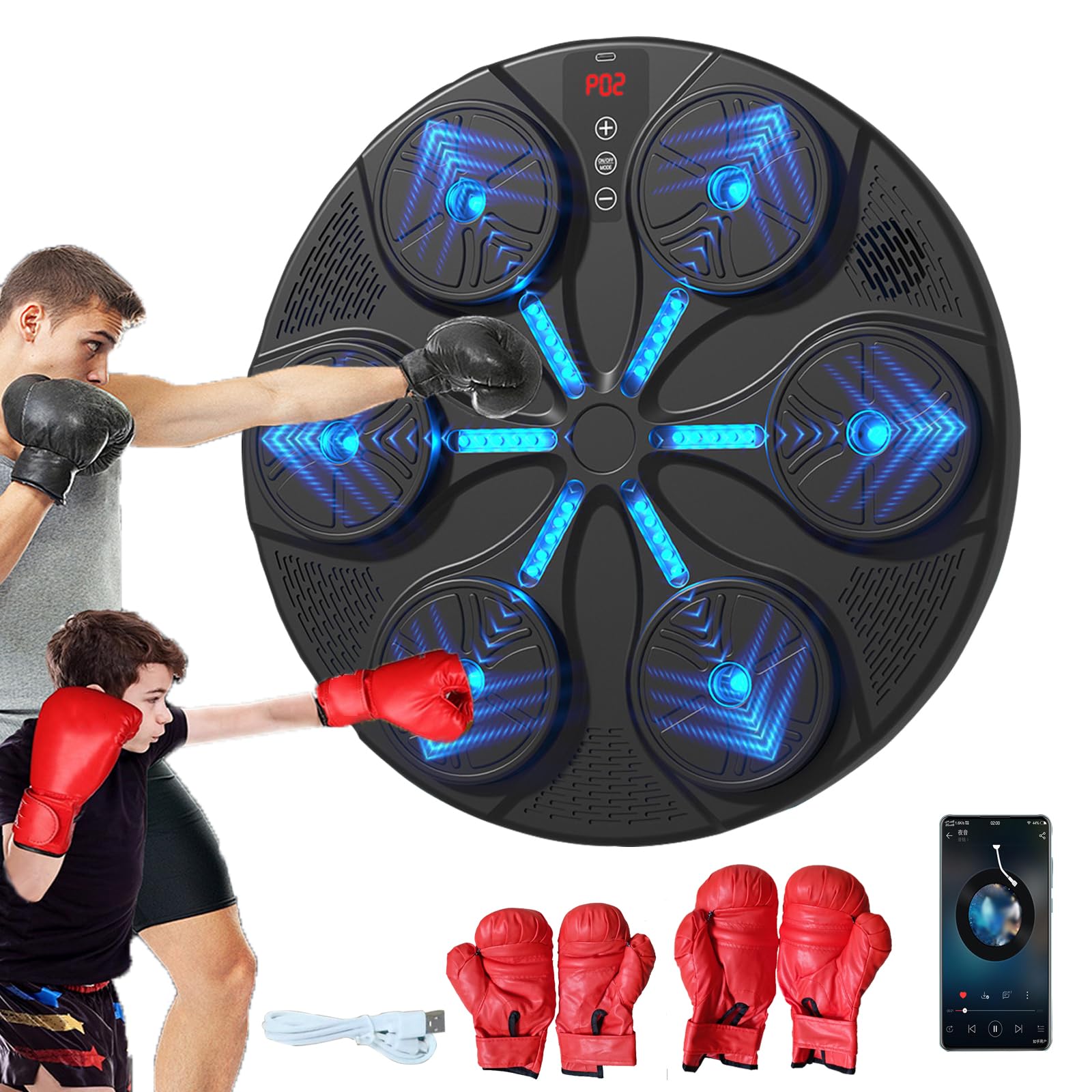 Máquina de boxeo musical inteligente con luces LED montados en la pared, 2 pares de guantes de boxeo para el hogar, niños y adulto