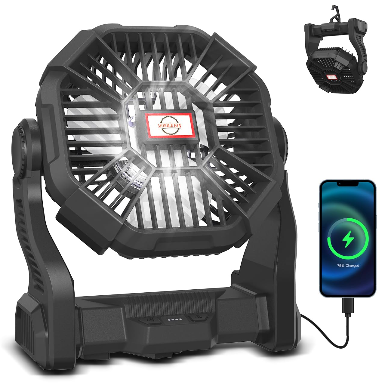 Ventilador de camping portátil con luz LED, batería recargable de 20000 mAh, brillo y velocidad ajustables, diseño colgante y de m