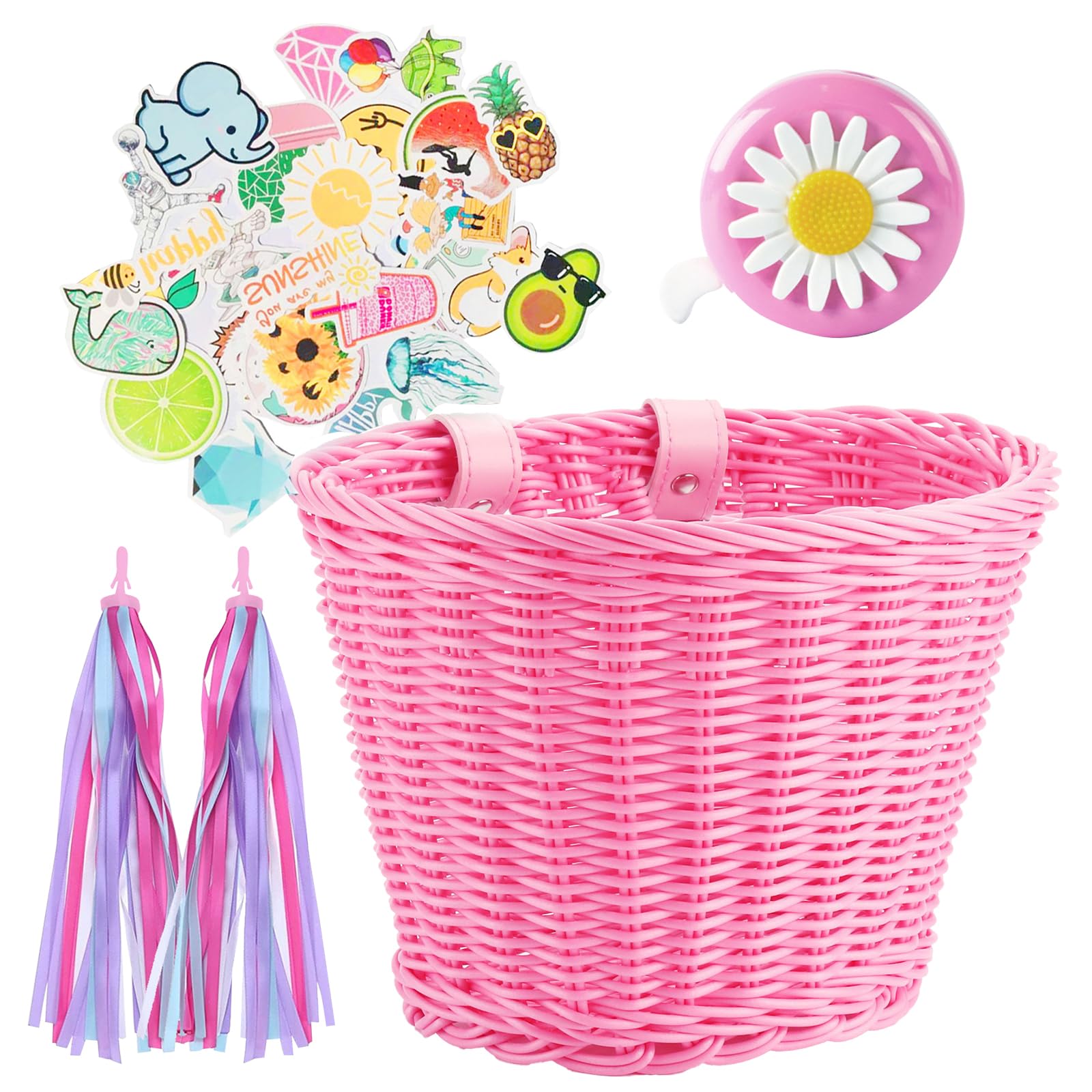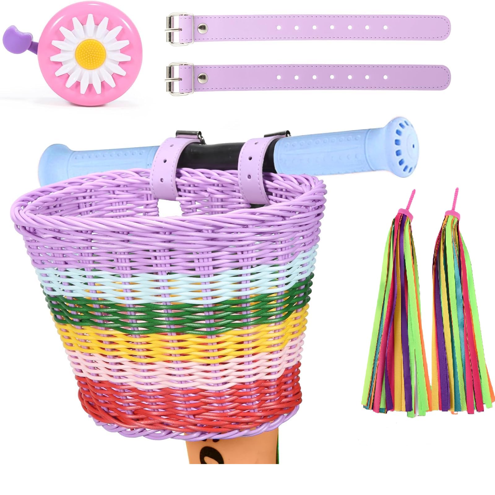Cesta de bicicleta para niños con manillar delantero de mimbre ajustable, serpentinas coloridas, campana de bicicleta para niños,