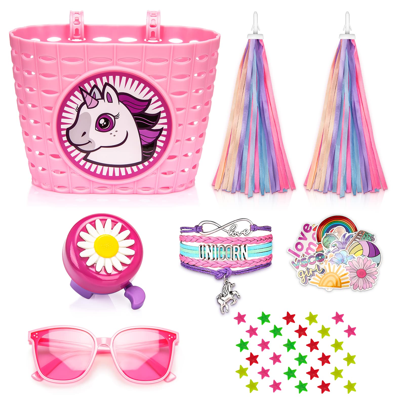 Cesta de bicicleta para niñas, cesta de bicicleta para manillar con pulsera de unicornio, campana, serpentinas, calcomanías, gafas