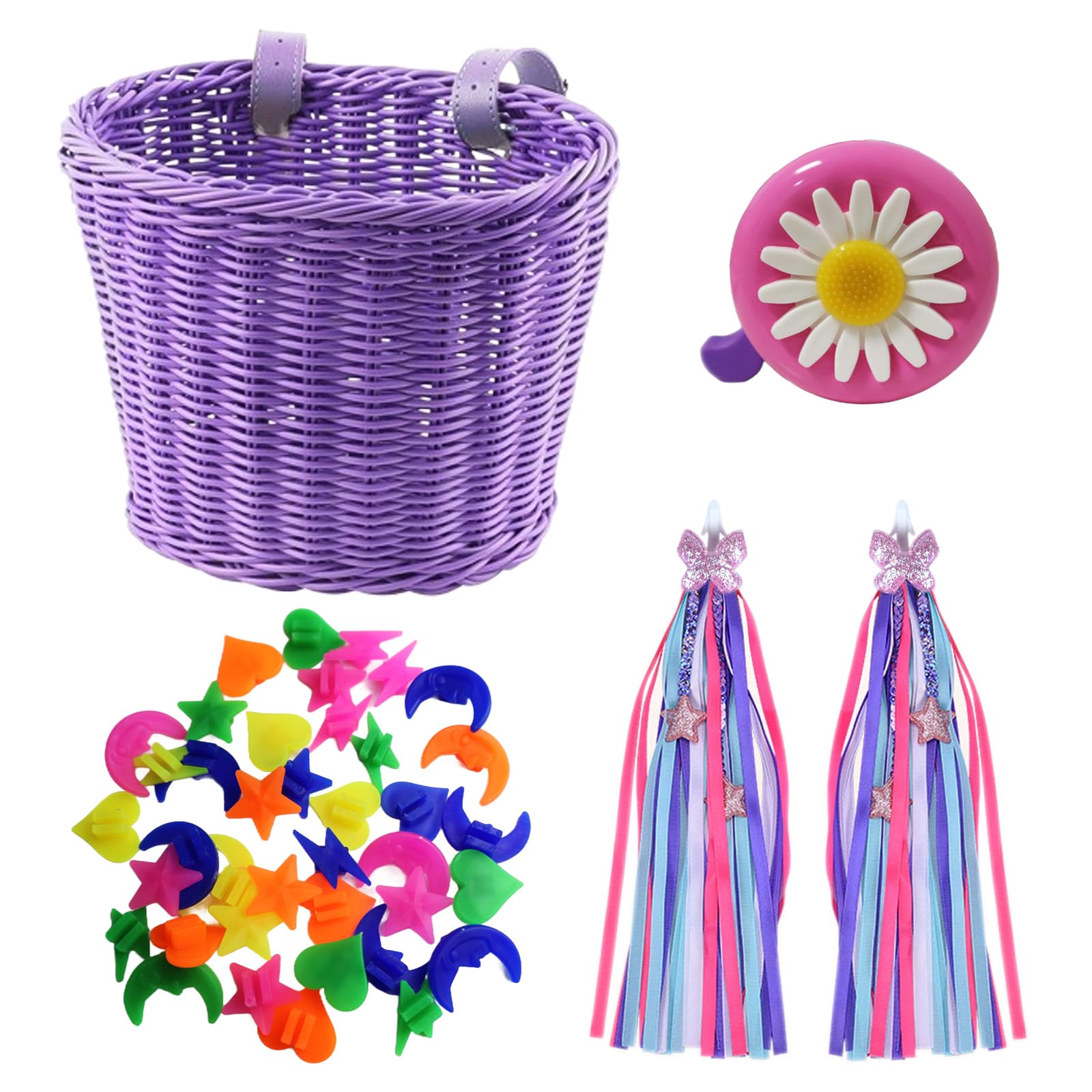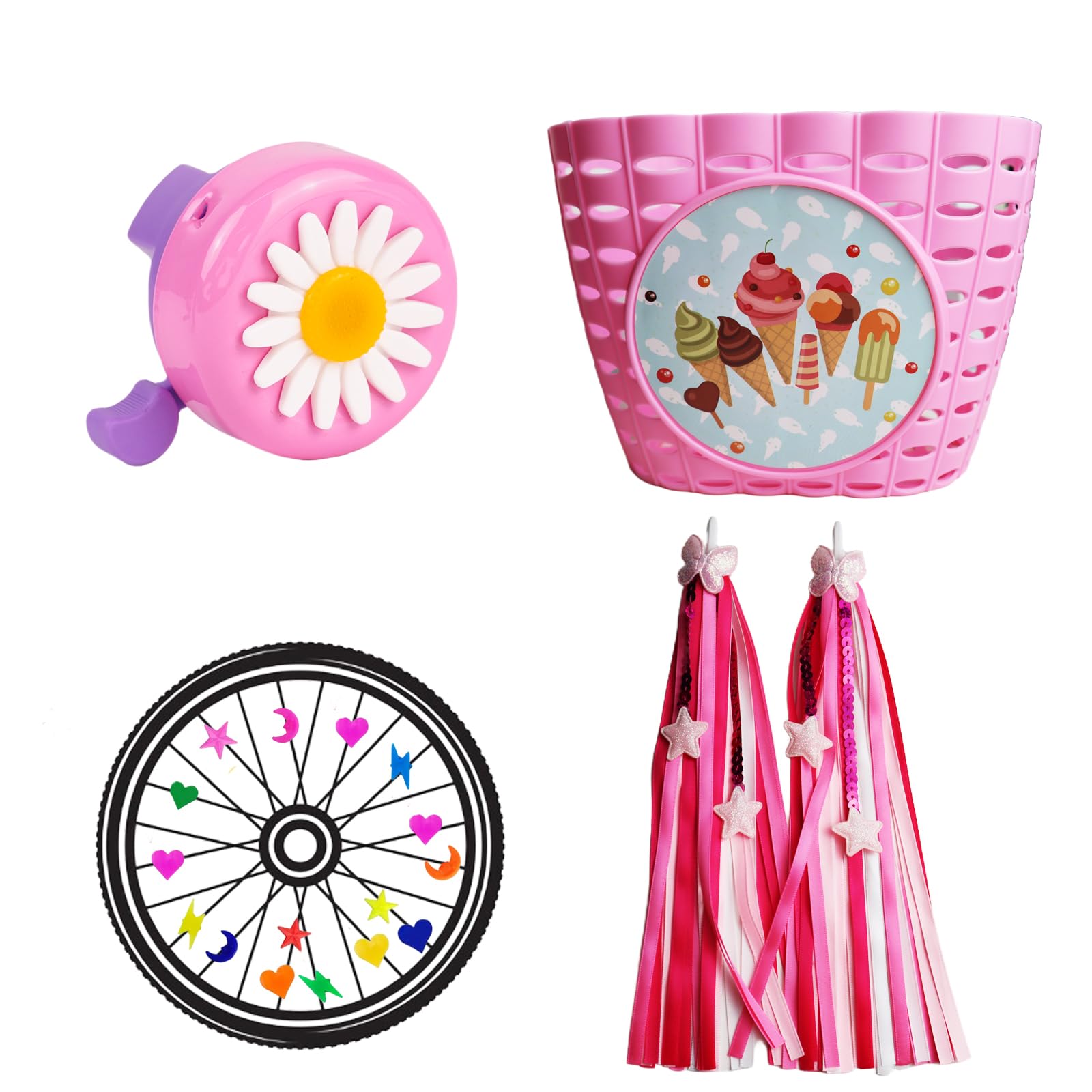 Juego de accesorios de bicicleta para niños con cesta de bicicleta, campana, serpentinas de bicicleta, cuentas de radios para niña