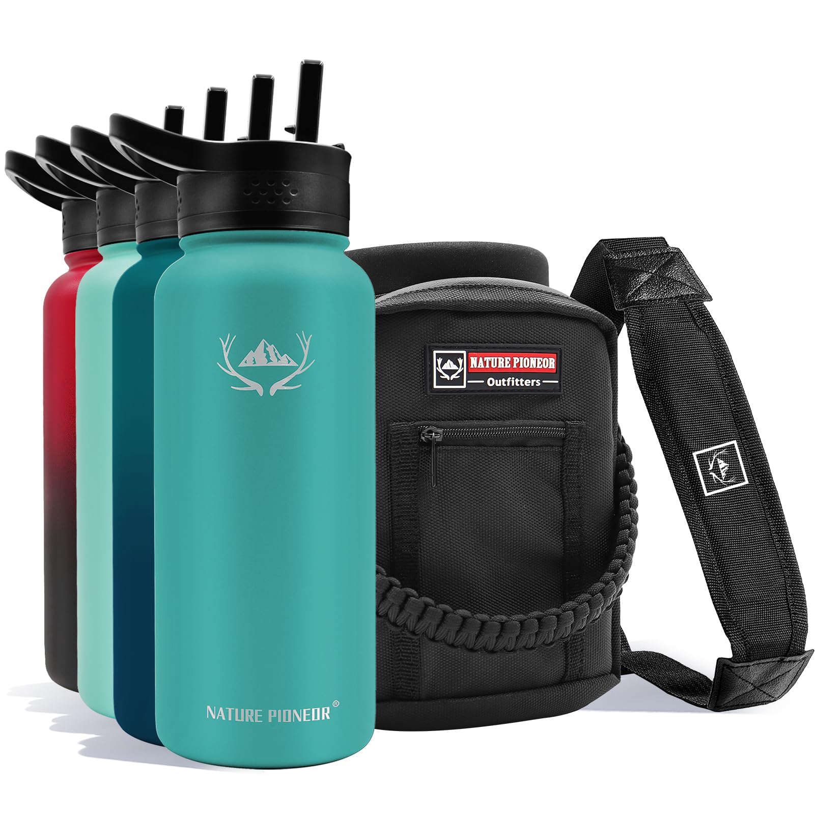 NATURE PIONEOR Botellas de agua aisladas con funda de soporte, botella de agua de acero inoxidable de 32 onzas con 3 tapas, pajita
