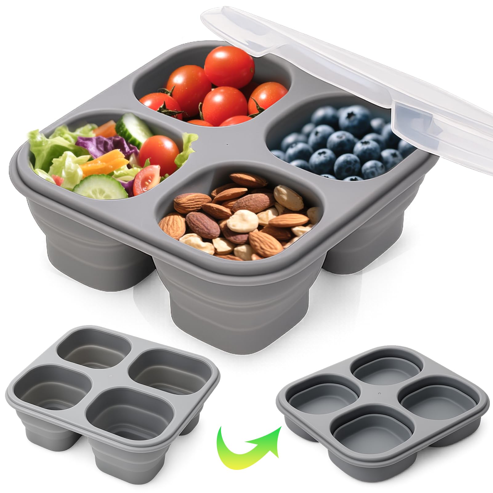 Juome Recipientes reutilizables de silicona con tapas, contenedores plegables de 4 compartimentos para niños, a prueba de fugas, c