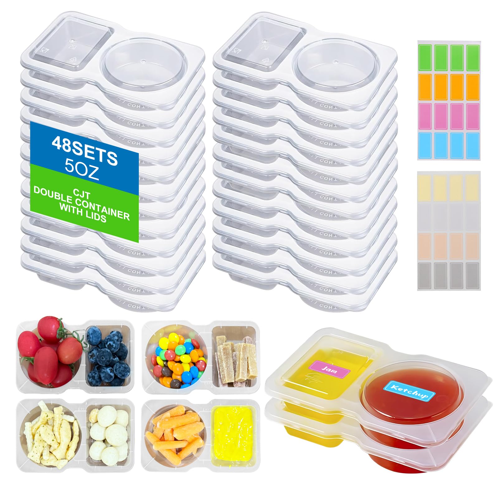 48 juegos de contenedores de condimentos de doble compartimento con tapas, contenedores desechables de 2 compartimentos para salsa