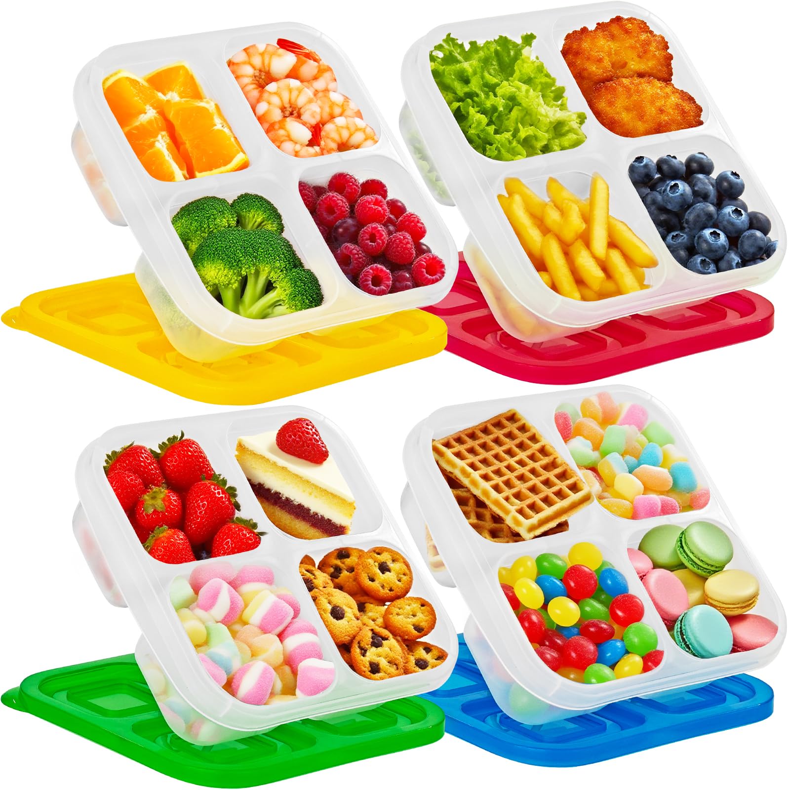 Juego de 4 recipientes para aperitivos con 3 compartimentos extraíbles, caja de aperitivos reutilizable con tapas, recipientes api