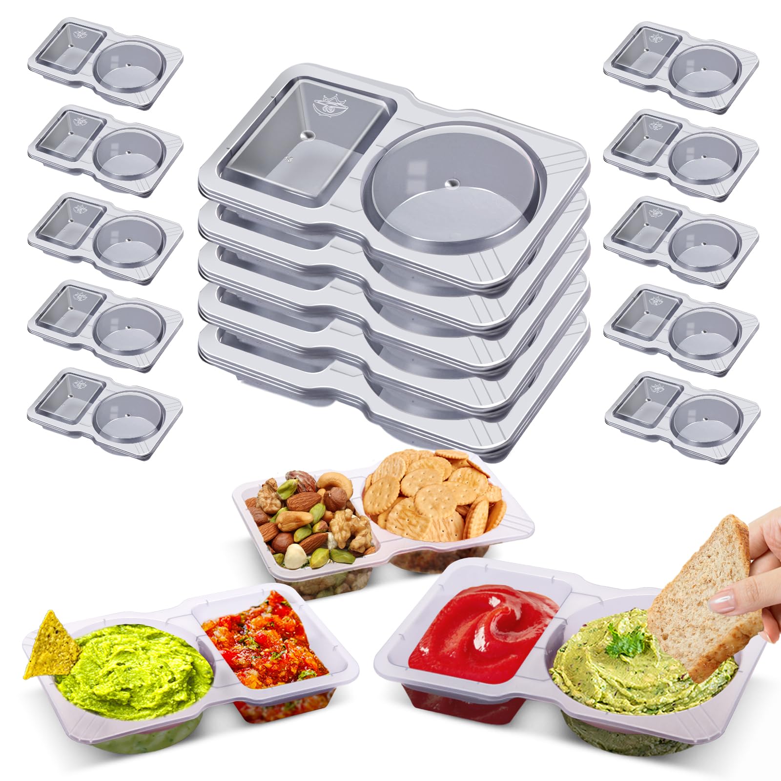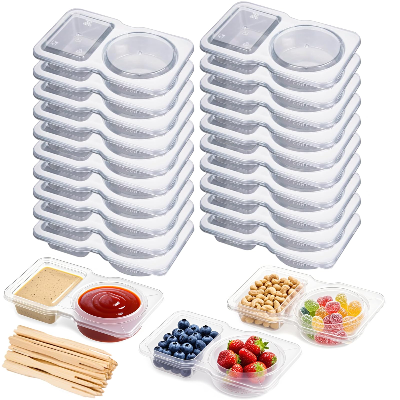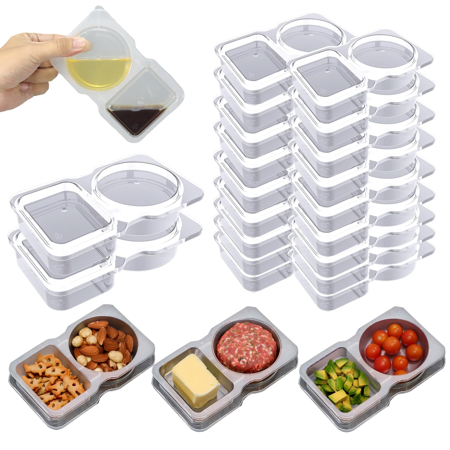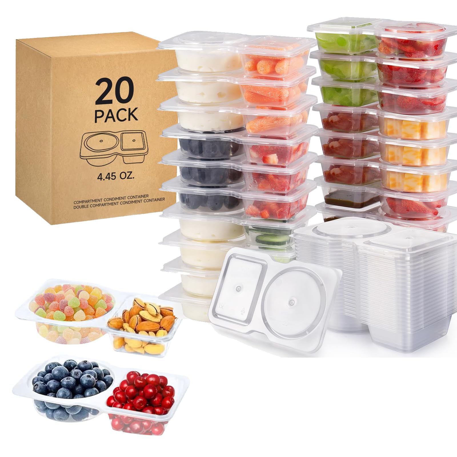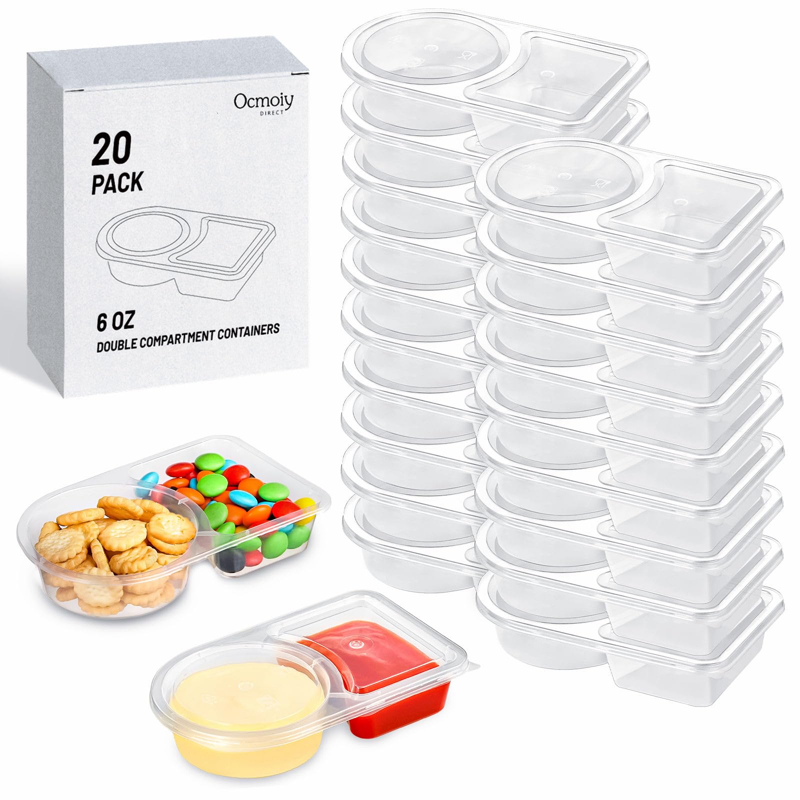 Ocmoiy 20 recipientes reutilizables para aperitivos con tapas, 2 compartimentos para aperitivos, contenedores de condimentos para