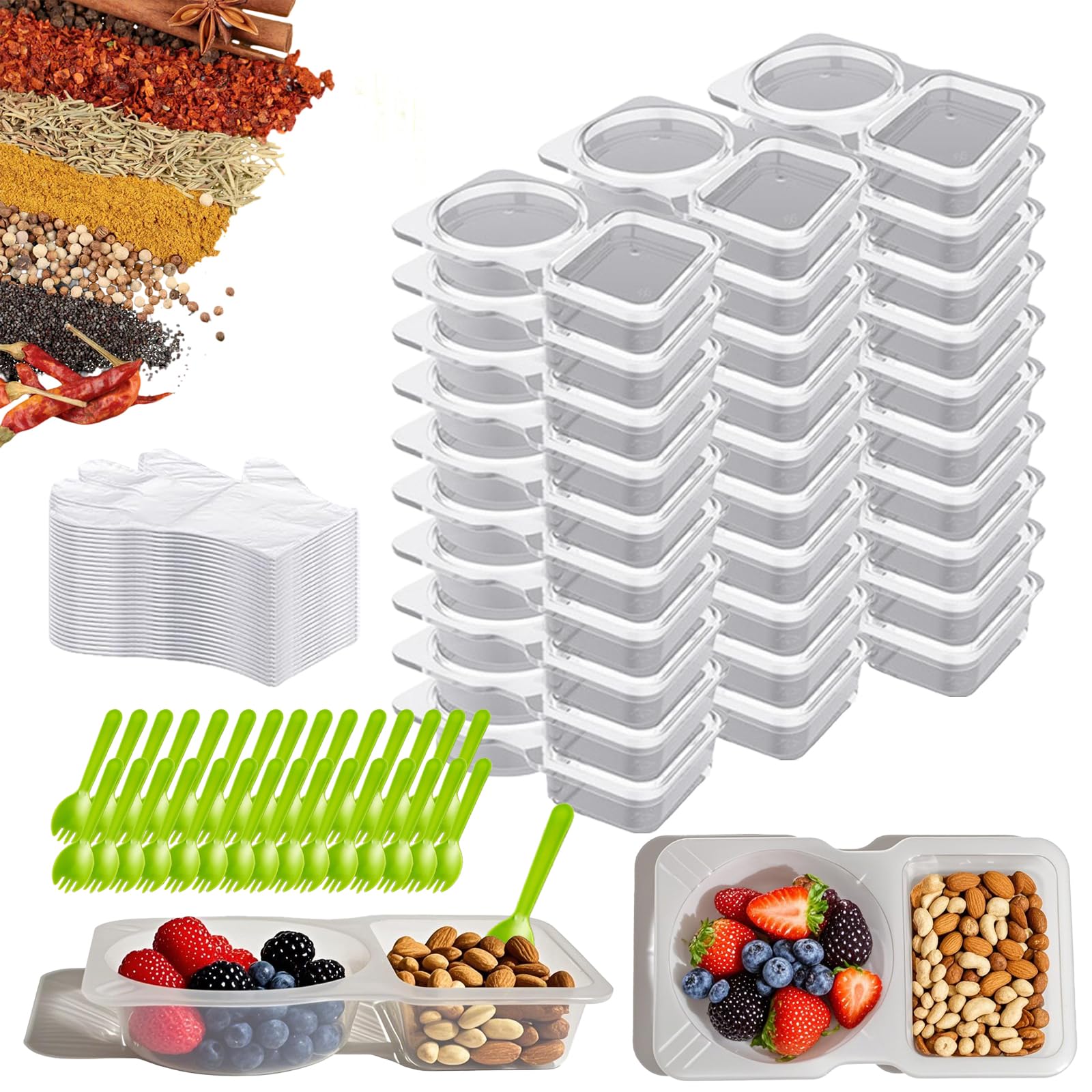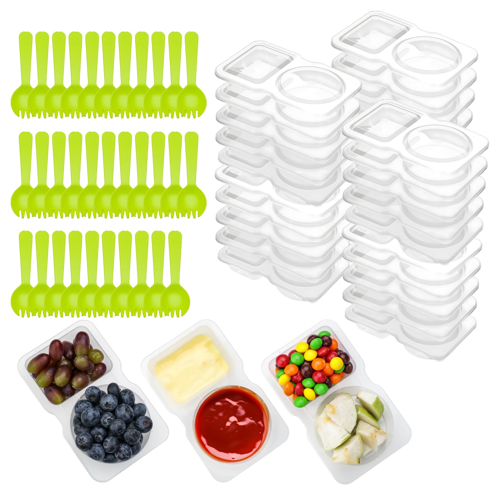 64 recipientes reutilizables para aperitivos, 32 juegos de recipientes para condimentos y 32 cucharas, recipientes de doble compar