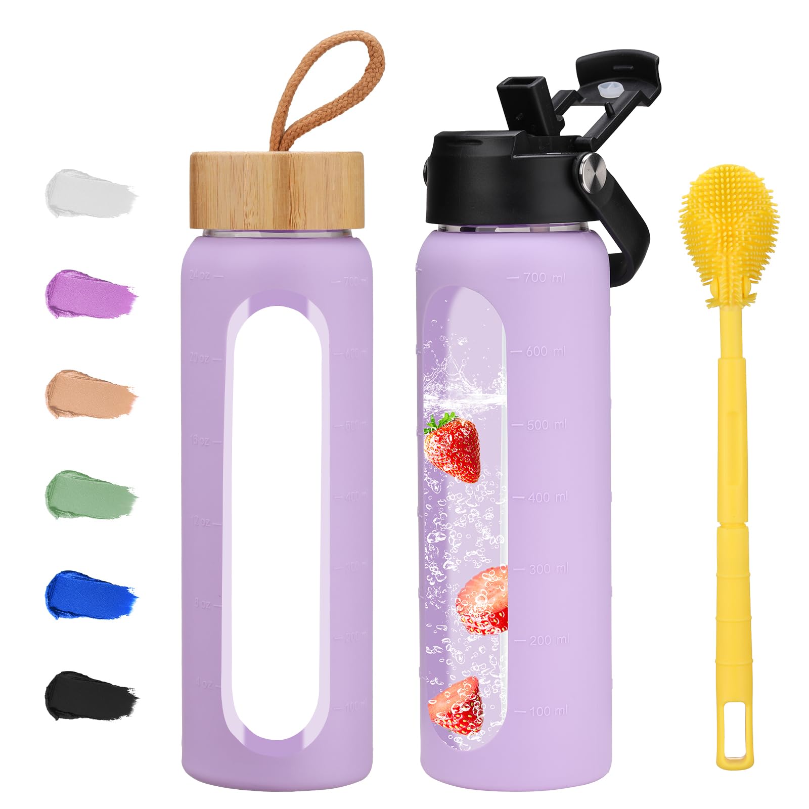 MUKOKO Botella de agua de vidrio de 24 onzas con 2 tapas, tapa abatible y tapa de popote de bambú, vaso de agua motivacional con r