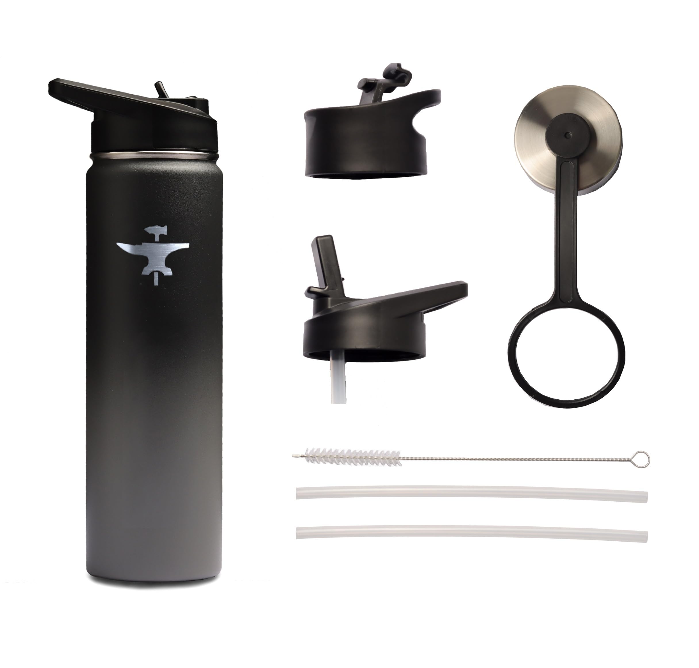 BodyForge – Botella de agua deportiva de 22 onzas, 3 tapas y tapa con popote, botellas de acero inoxidable para gimnasio y deporte