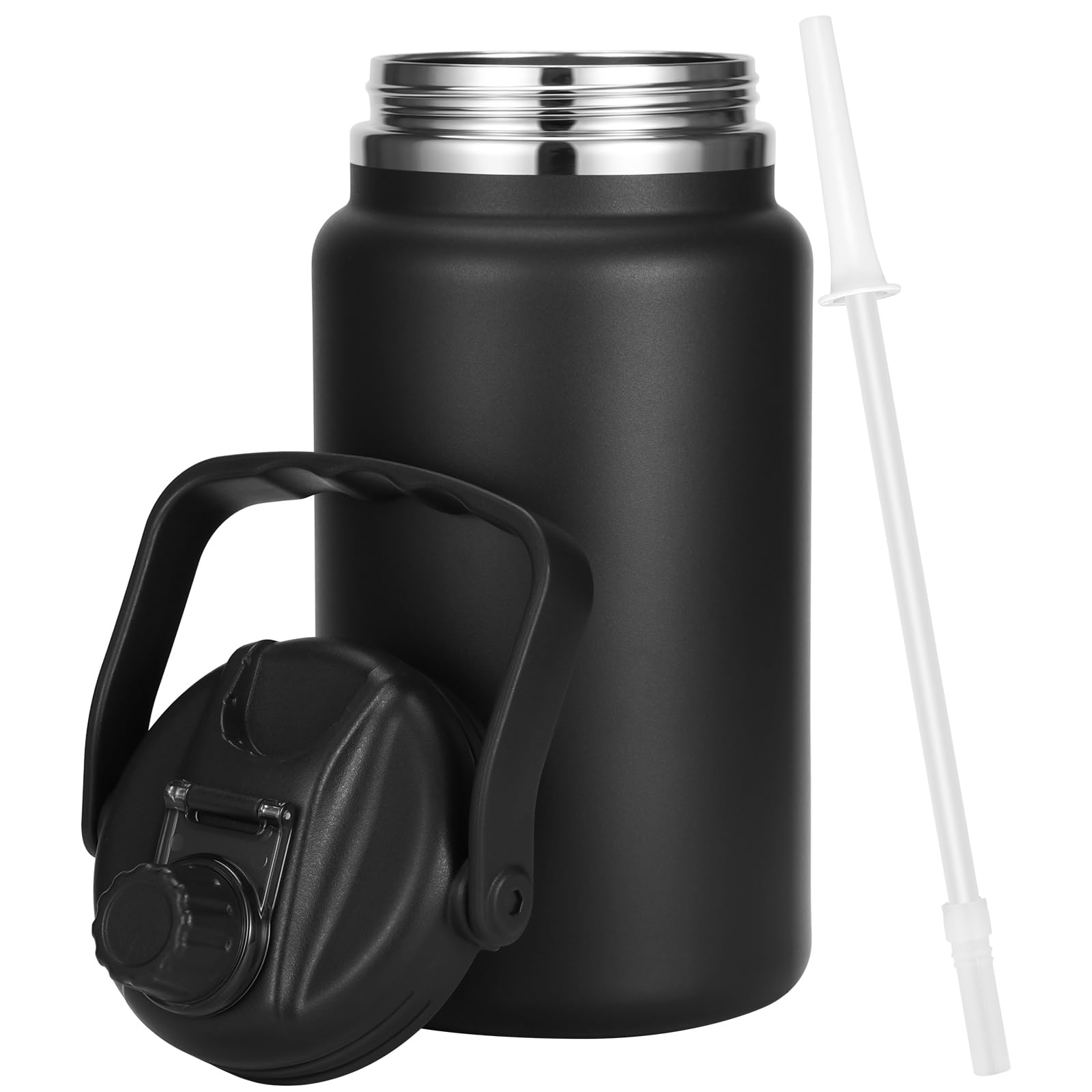 H2 Hydrology Botella de agua deportiva con 3 tapas (tapa de popote y tapa de boquilla), doble pared aislada al vacío, de acero ino
