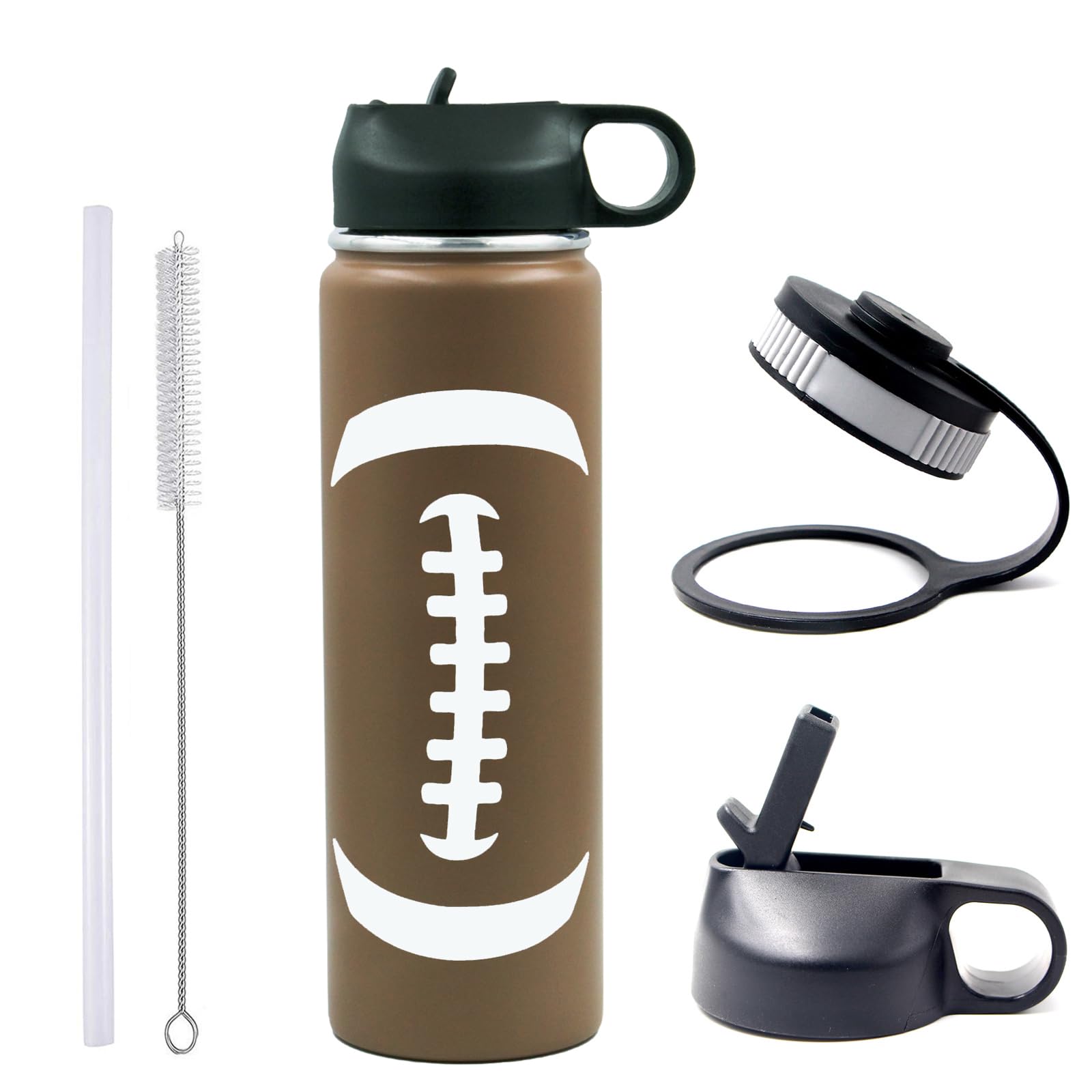 22 oz Football Water Bottle, Flask Sports Metal Thermos Travel Tumbler with 2 Lids, Stainless Steel Double Wall Vacuum Insulated L