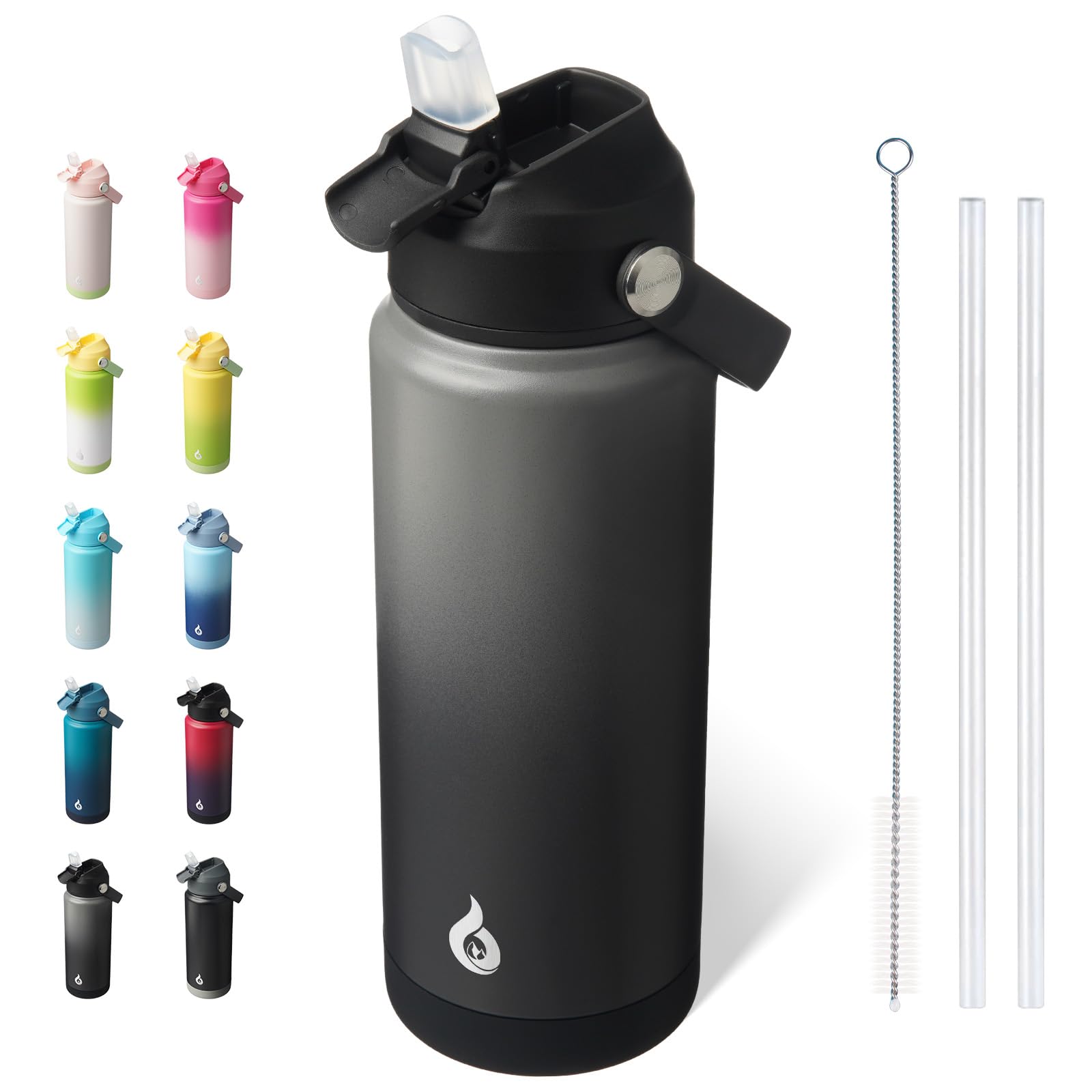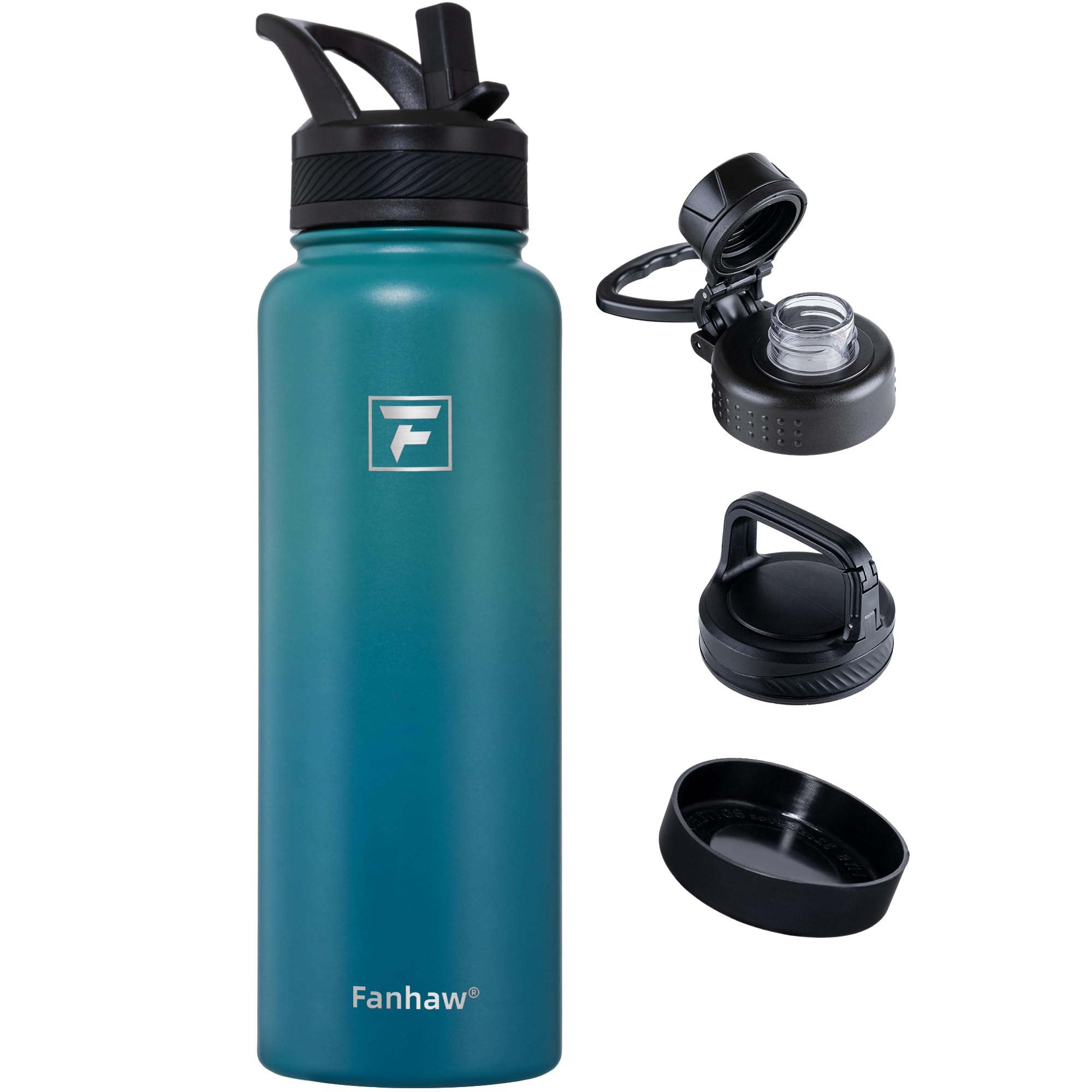Fanhaw Botella de agua aislada de 40 onzas, frasco de acero inoxidable con 3 tapas (pajilla, boquilla, mosquetón) | Duradera, a pr