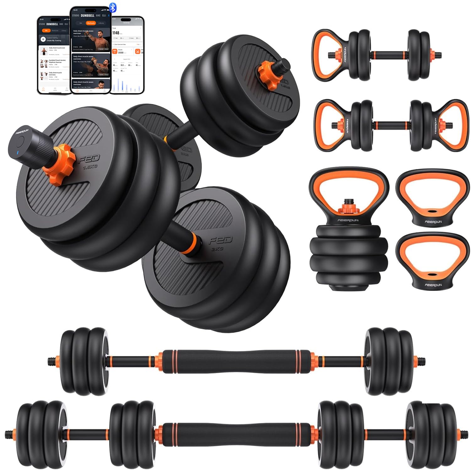 FEIERDUN Juego de mancuernas ajustables inteligentes, pesas libres de 20/30/45/70/90 libras, juego de mancuernas 5 en 1 para barra