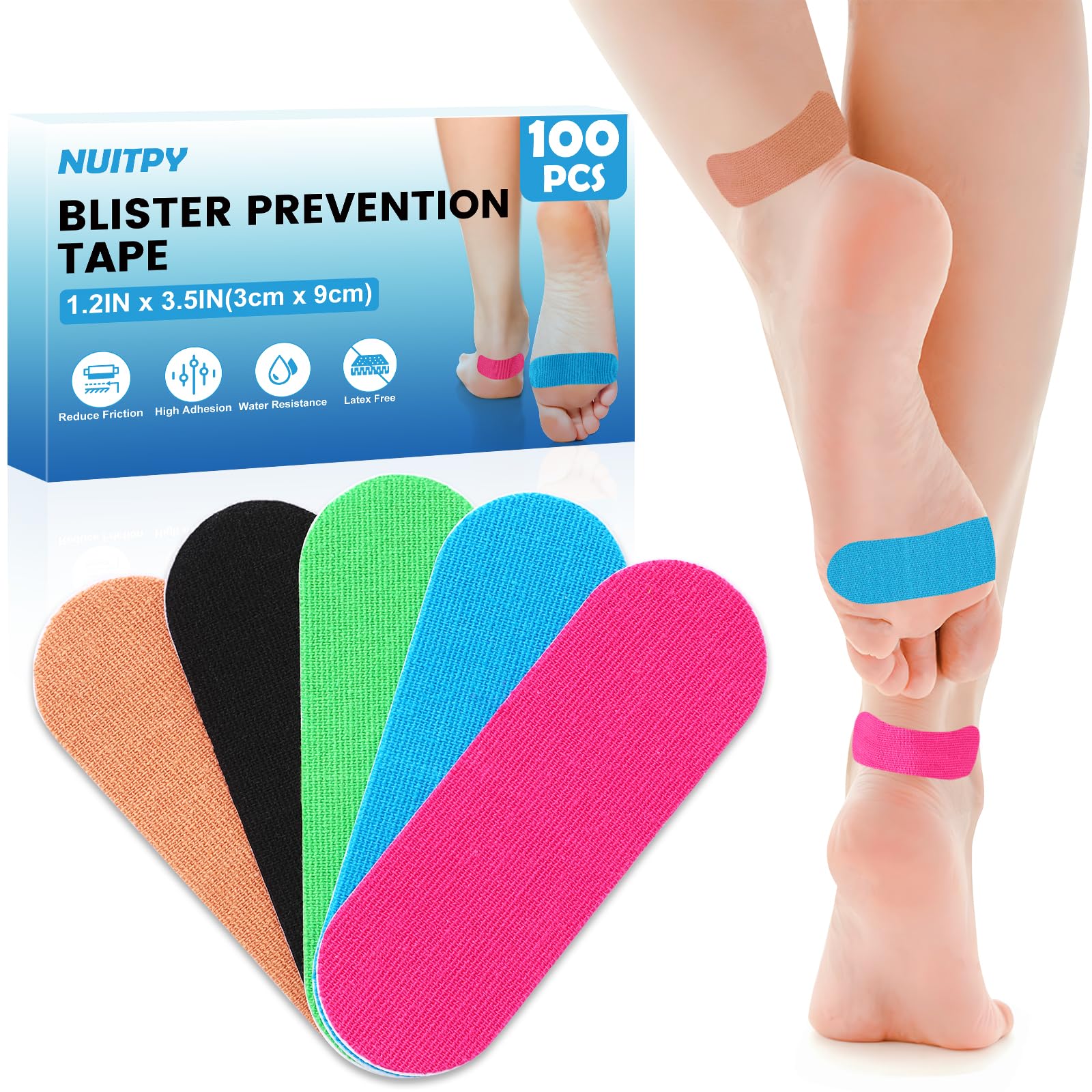100 cintas de prevención de ampollas, 5 colores de 1.2 x 3.5 pulgadas, vendajes precortados para dedos de los pies, talones, super