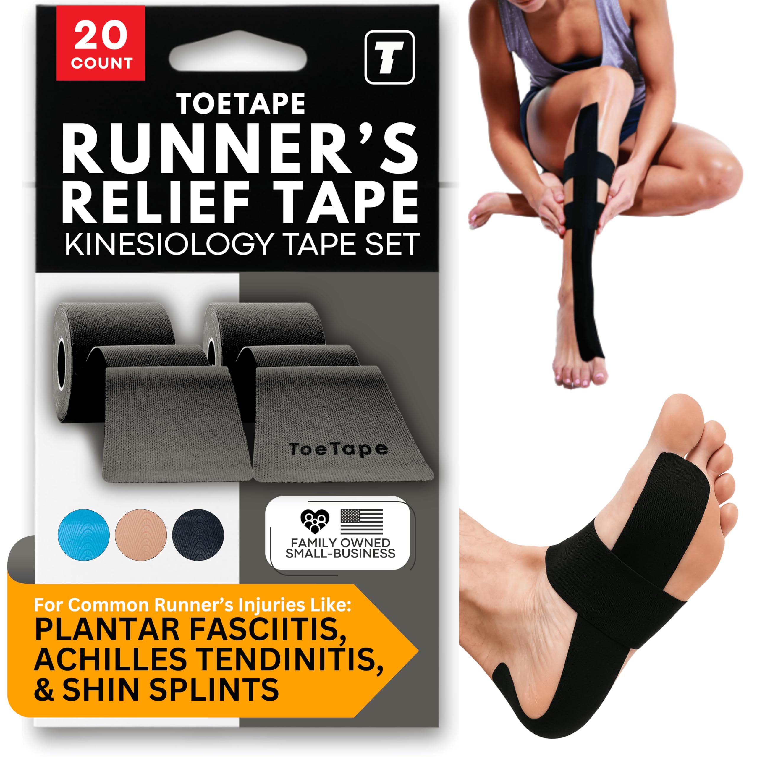 Cinta de kinesiología para fascitis plantar y espinilla, cinta de kinesiología precortada ToeTape Runner’s Relief | 20 aplicacione