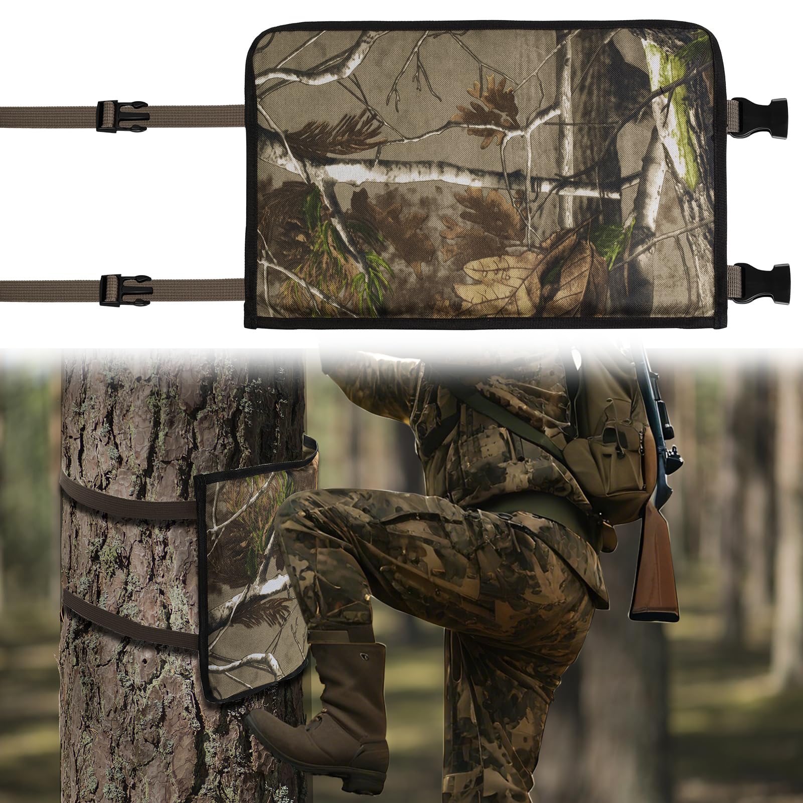 Rodillera de 16 x 11 pulgadas para caza de silla de montar con correa ajustable de 57 pulgadas, camuflaje para abrazar árboles, ro