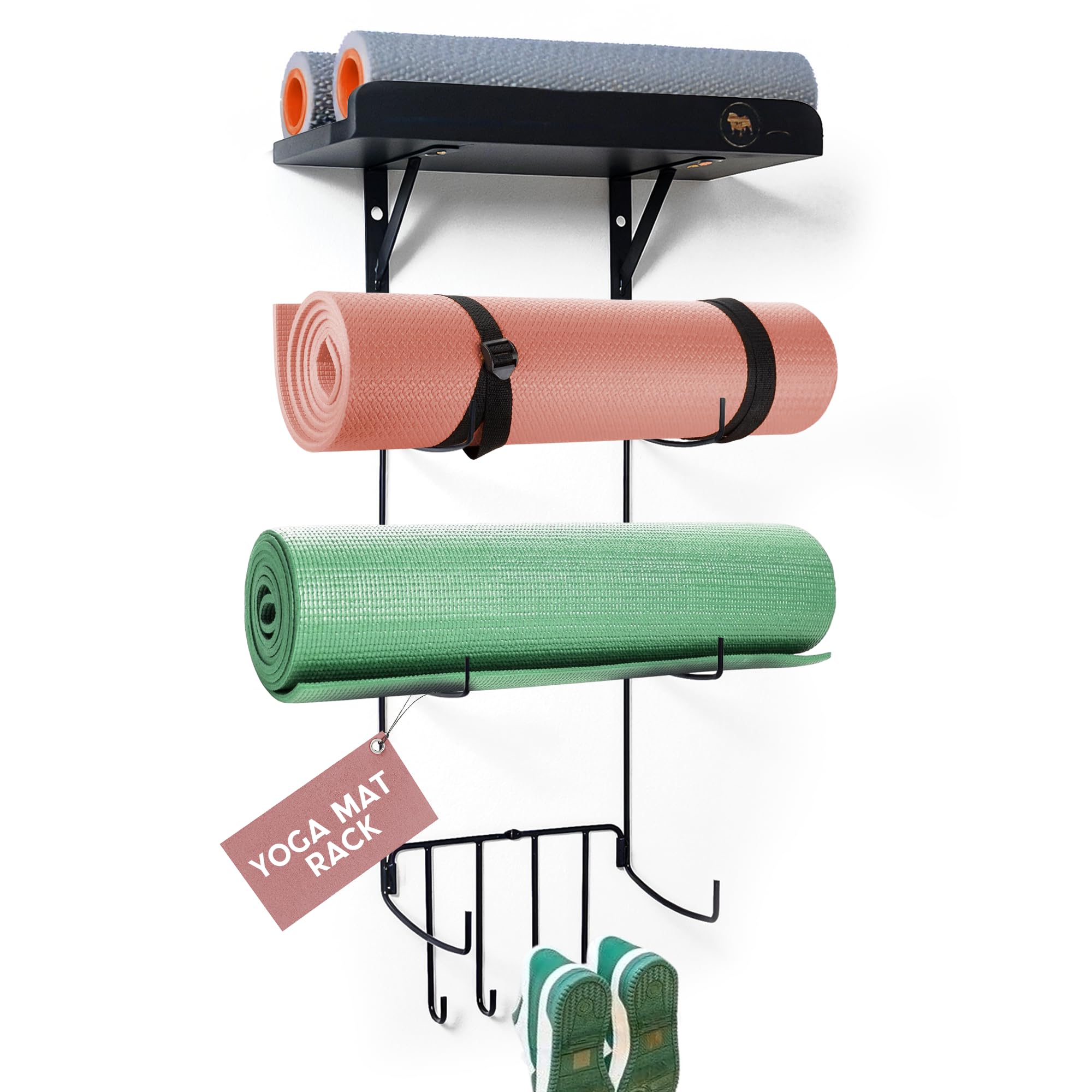 Olivia and Lily – Estante para esterillas de yoga de pared con estante de madera negra, organizador para esterillas de yoga, banda