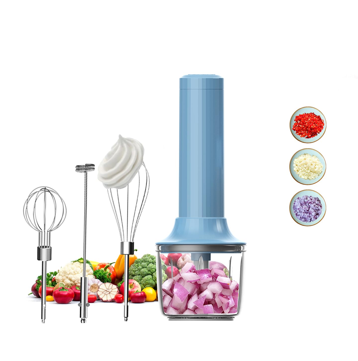 Batidora de mano eléctrica 4 en 1, mini picadora de cebolla y picadora de ajo, 10 onzas, varita espumadora de leche inalámbrica po