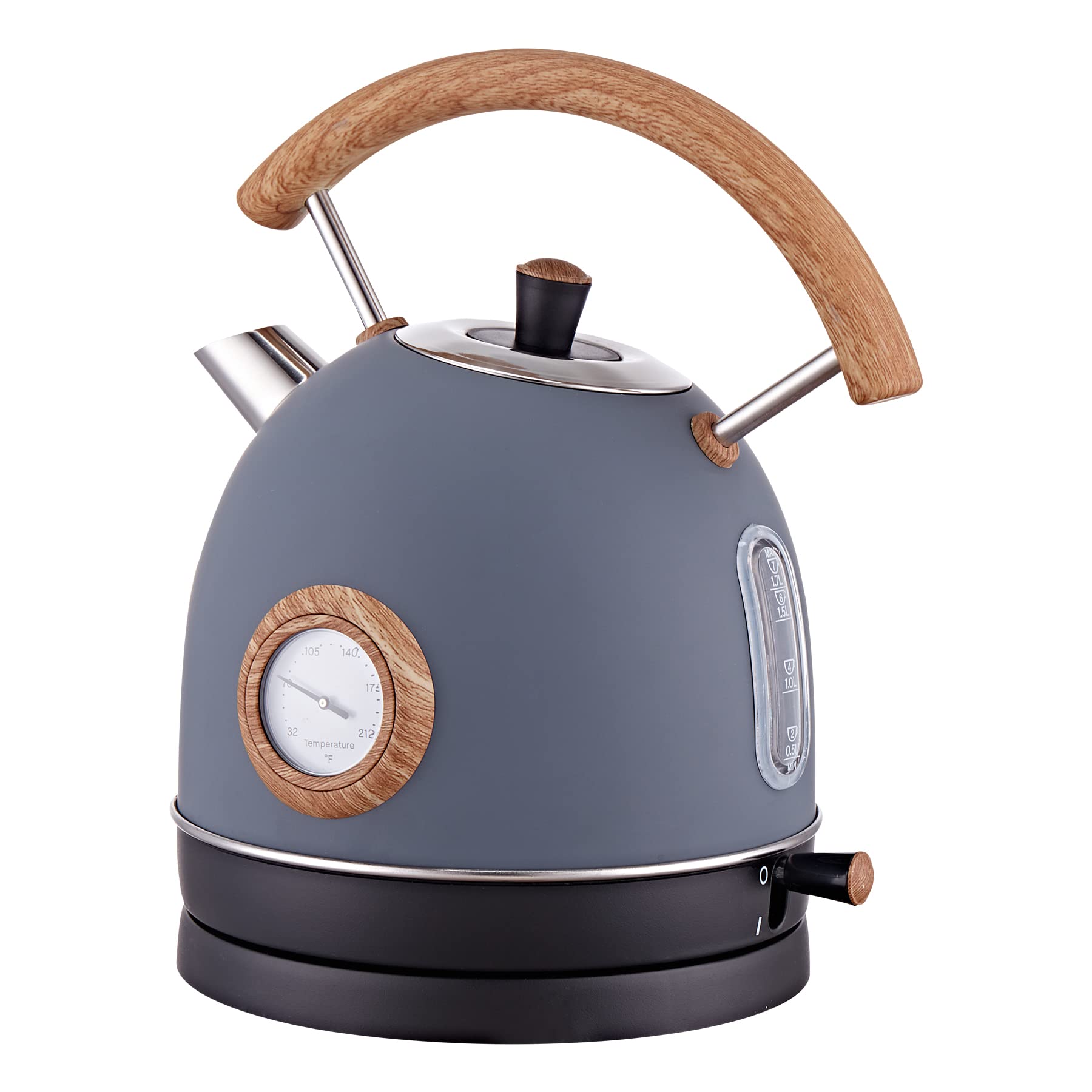 Tetera eléctrica retro, 1.7 l/1500 W para agua hirviendo, mango de madera, caldera de agua caliente de acero inoxidable azul con p