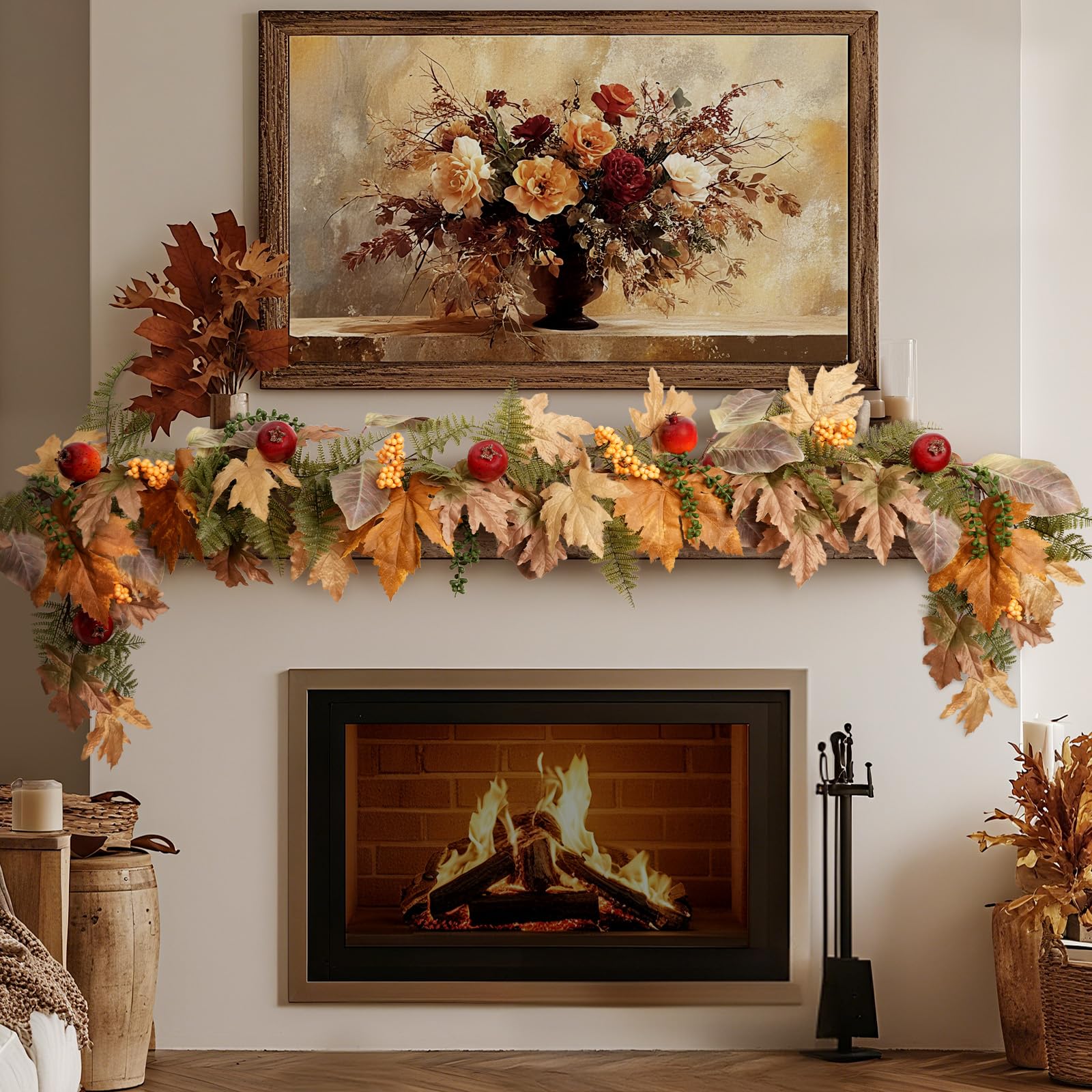 Decoraciones de otoño para el hogar – Decoración de otoño – Guirnalda de hojas de arce de otoño de 6 pies, granadas y bayas – Deco