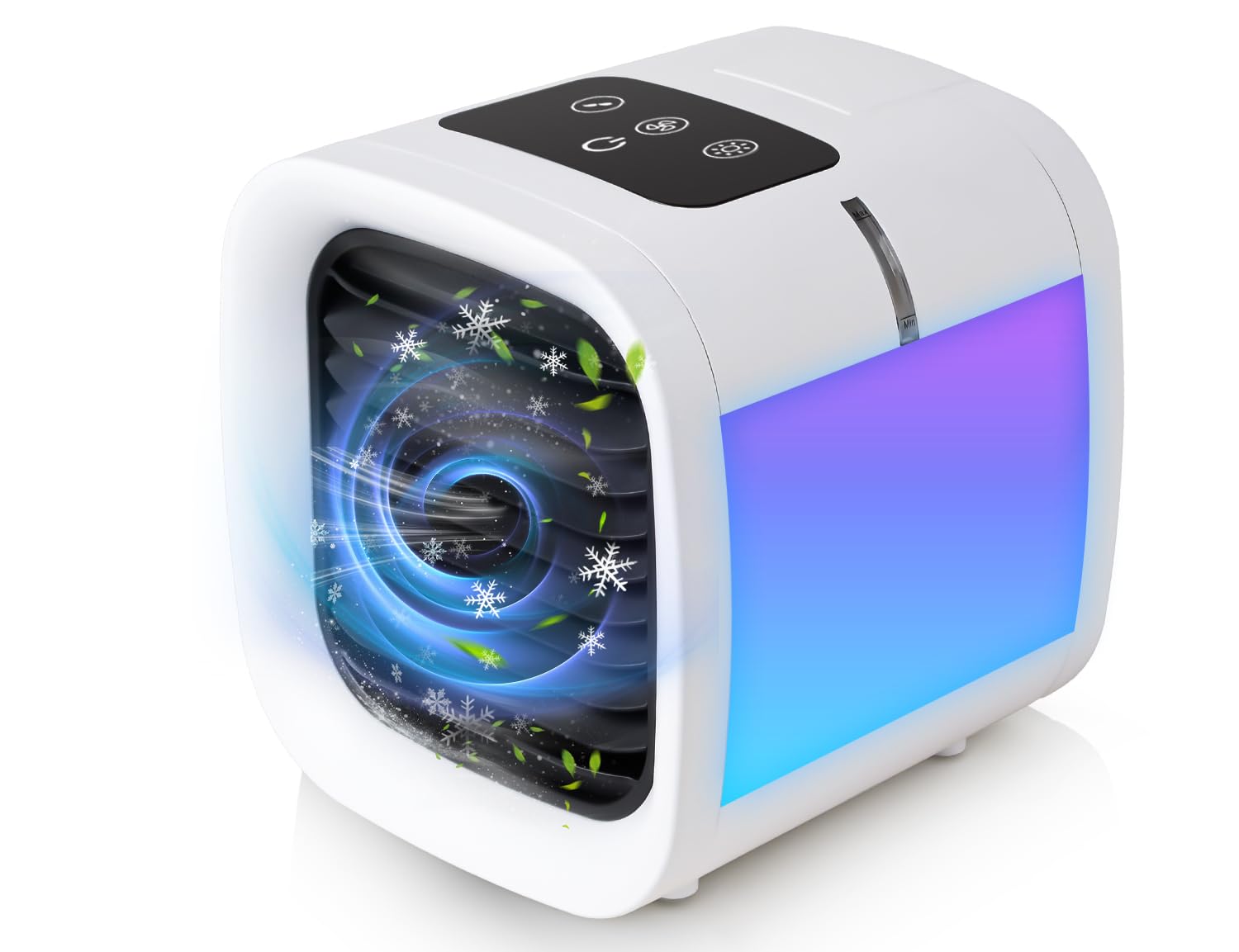 Enfriador de aire evaporativo, 5 velocidades, 2 ajustes de niebla, tanque de agua de 12.5 onzas, luces ambientales de 7 colores, e