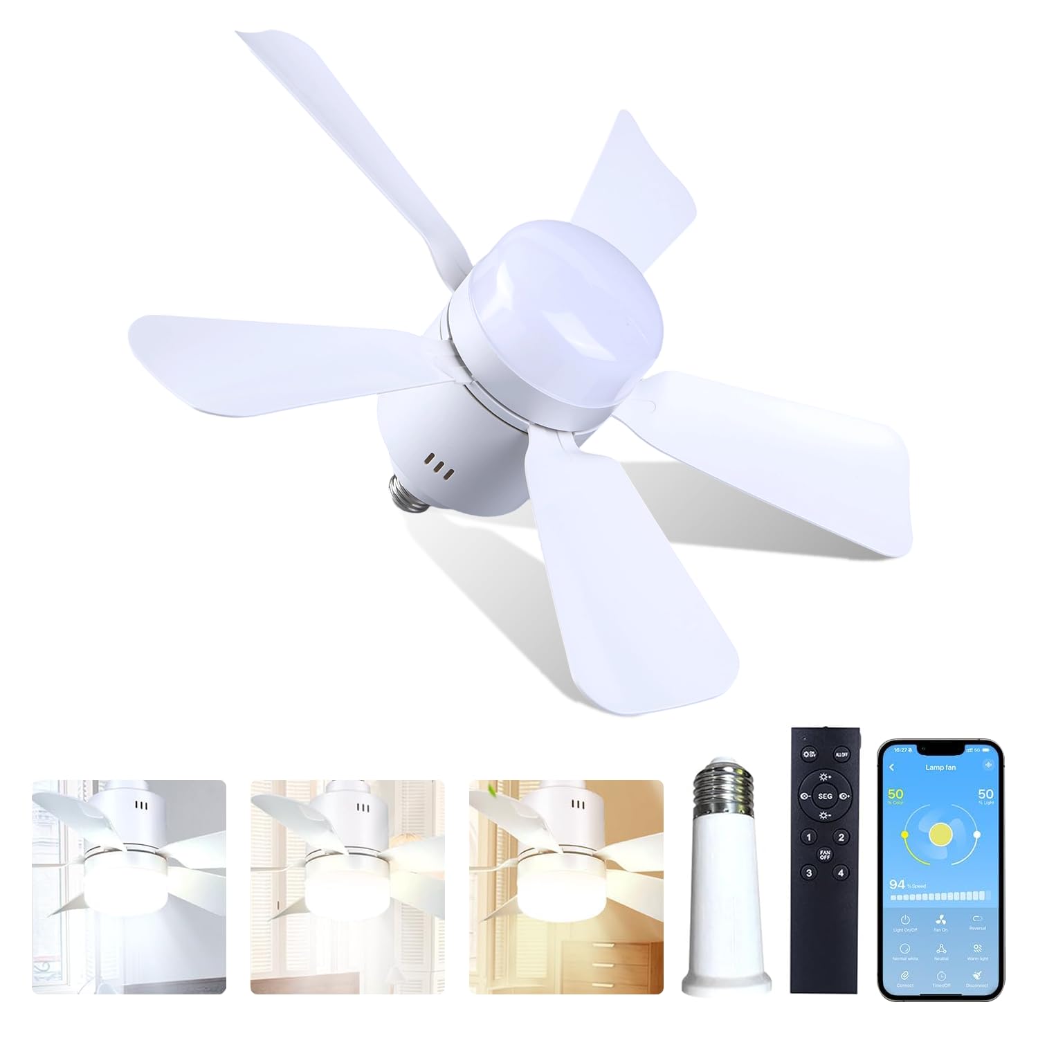 Ventilador de techo atornillado con luces LED y control remoto, 3 colores ajustables de 4 niveles de velocidad, ventiladores de te