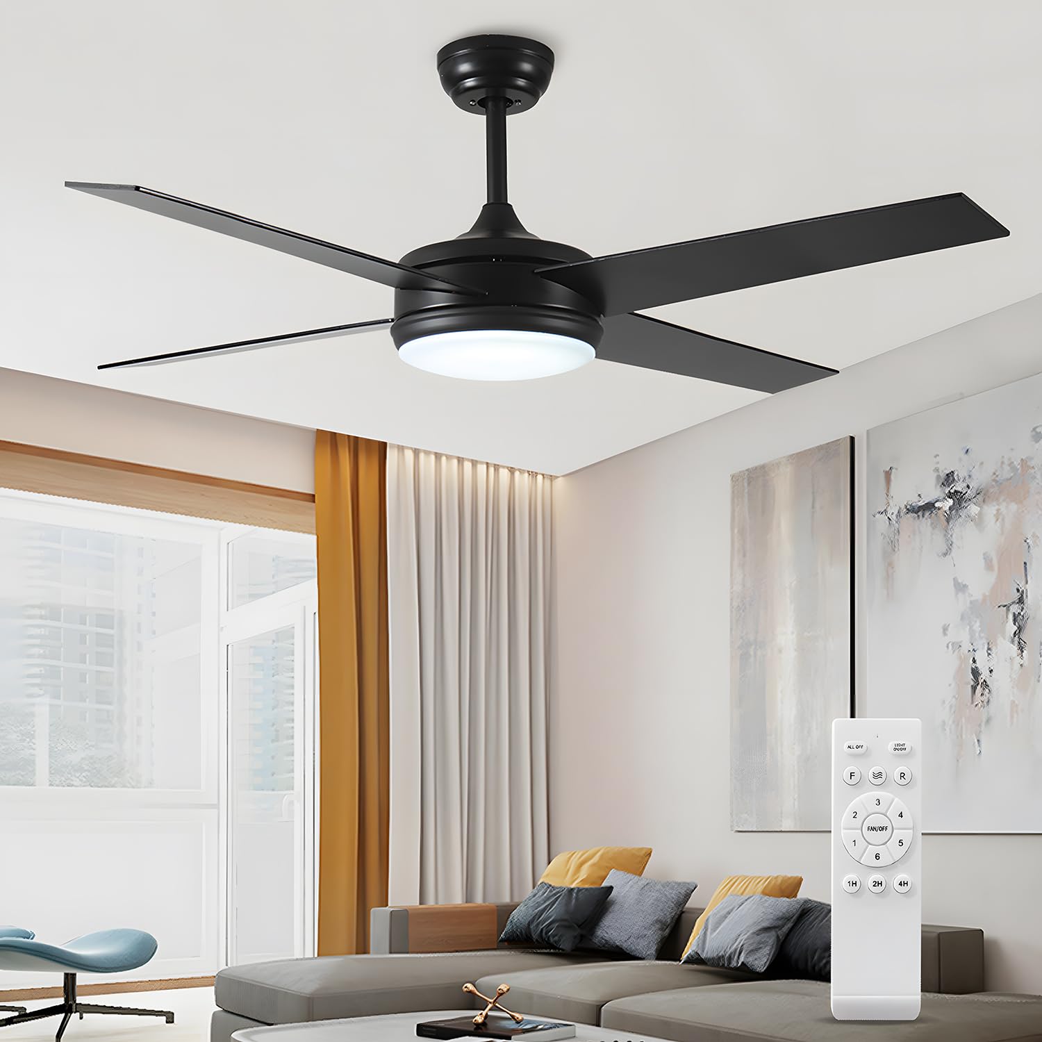 52 Inch Ceiling Fans with Lights and Remote Control, Low Profile Flush Mount, Quiet Reversible DC Motor, Modern Matte Black Finish