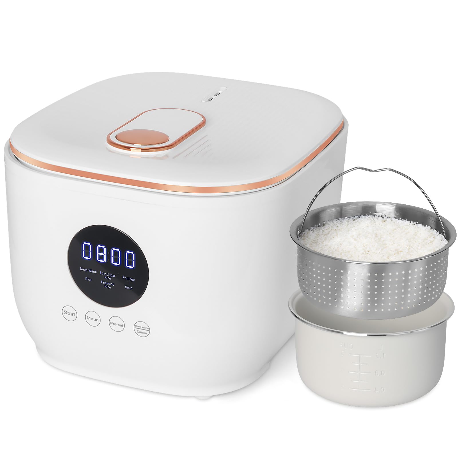 Arrocera baja en azúcar para 6 tazas, con cesta de vapor de arroz, olla de arroz inteligente para eliminar almidones, 5 funciones