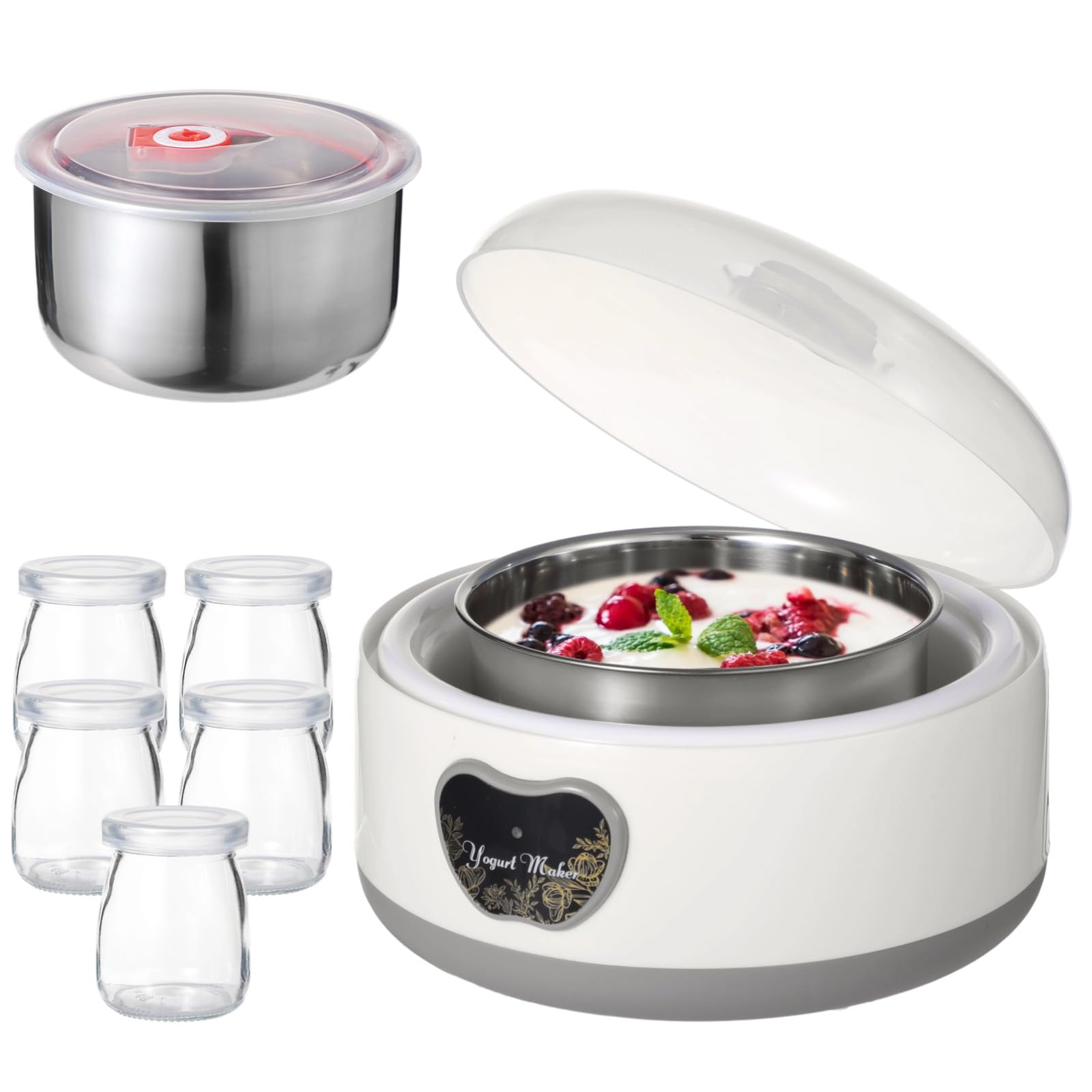 Máquina para hacer yogur de 15 W, 1.2 L Máquina automática de yogur de acero inoxidable con 5 tarros de vidrio de sellado hermétic