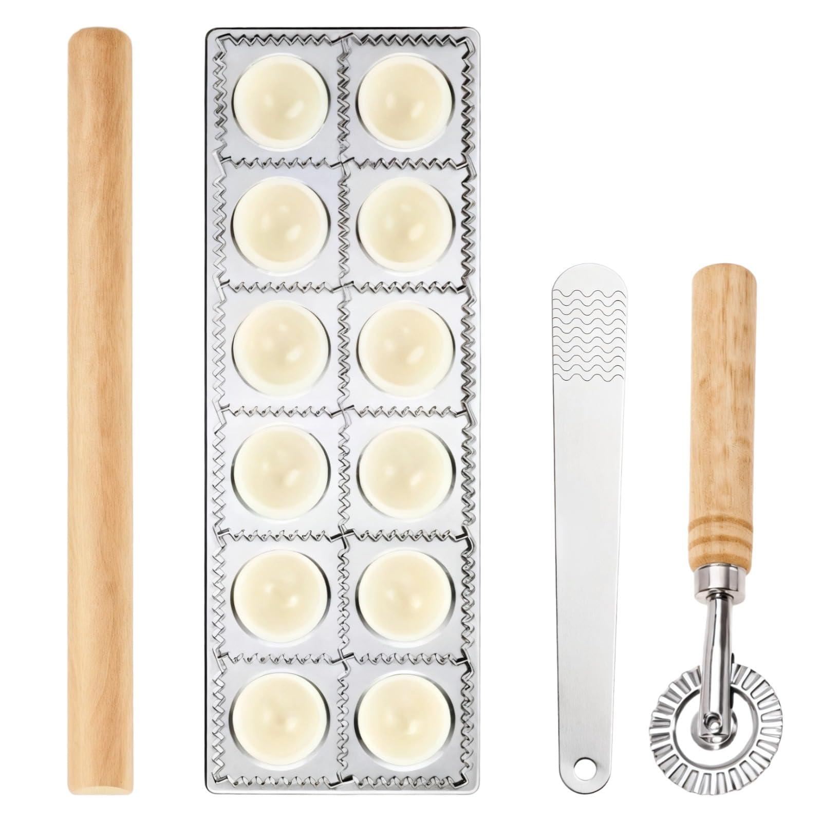Juego de moldes para ravioles – 5 piezas de máquina para hacer ravioles incluye 12 agujeros para hacer ravioles, rodillo de madera