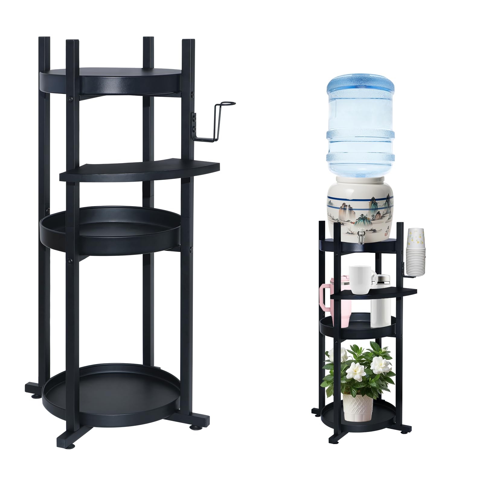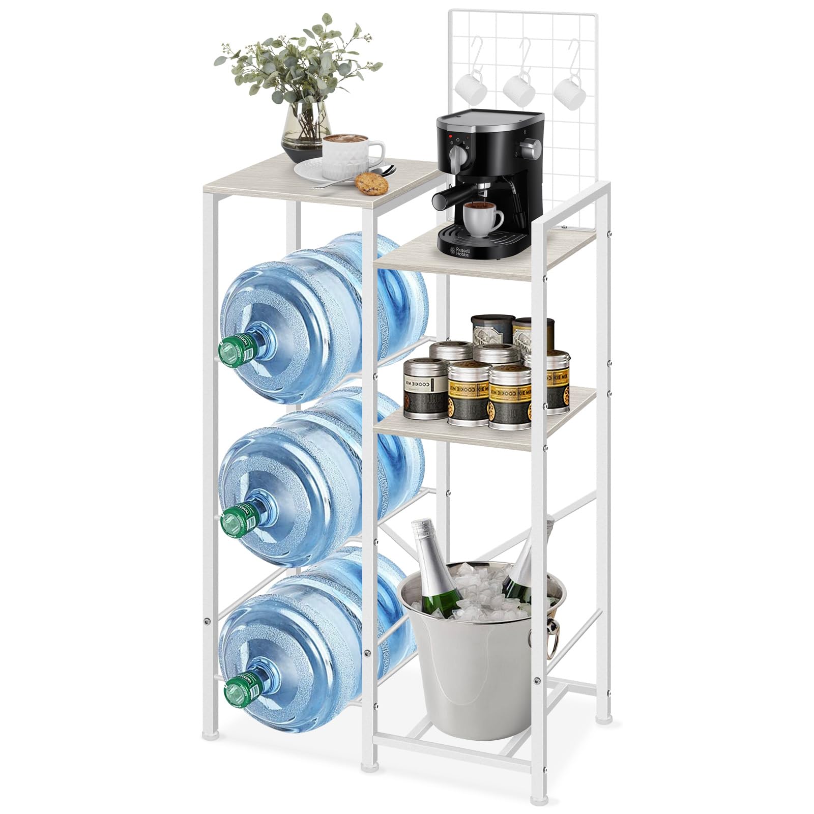 Soporte dispensador de agua para botella de 5 galones, soporte de esquina de 3 niveles con estante curvado para tazas para botella