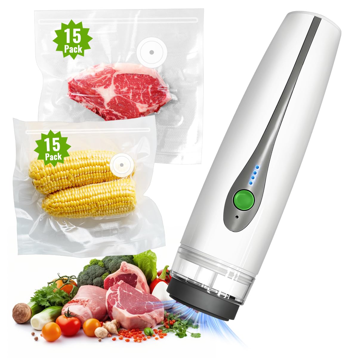 BOSIMIA Sellador al vacío de mano compacto para almacenamiento de alimentos con 30 bolsas de vacío reutilizables, máquina sellador