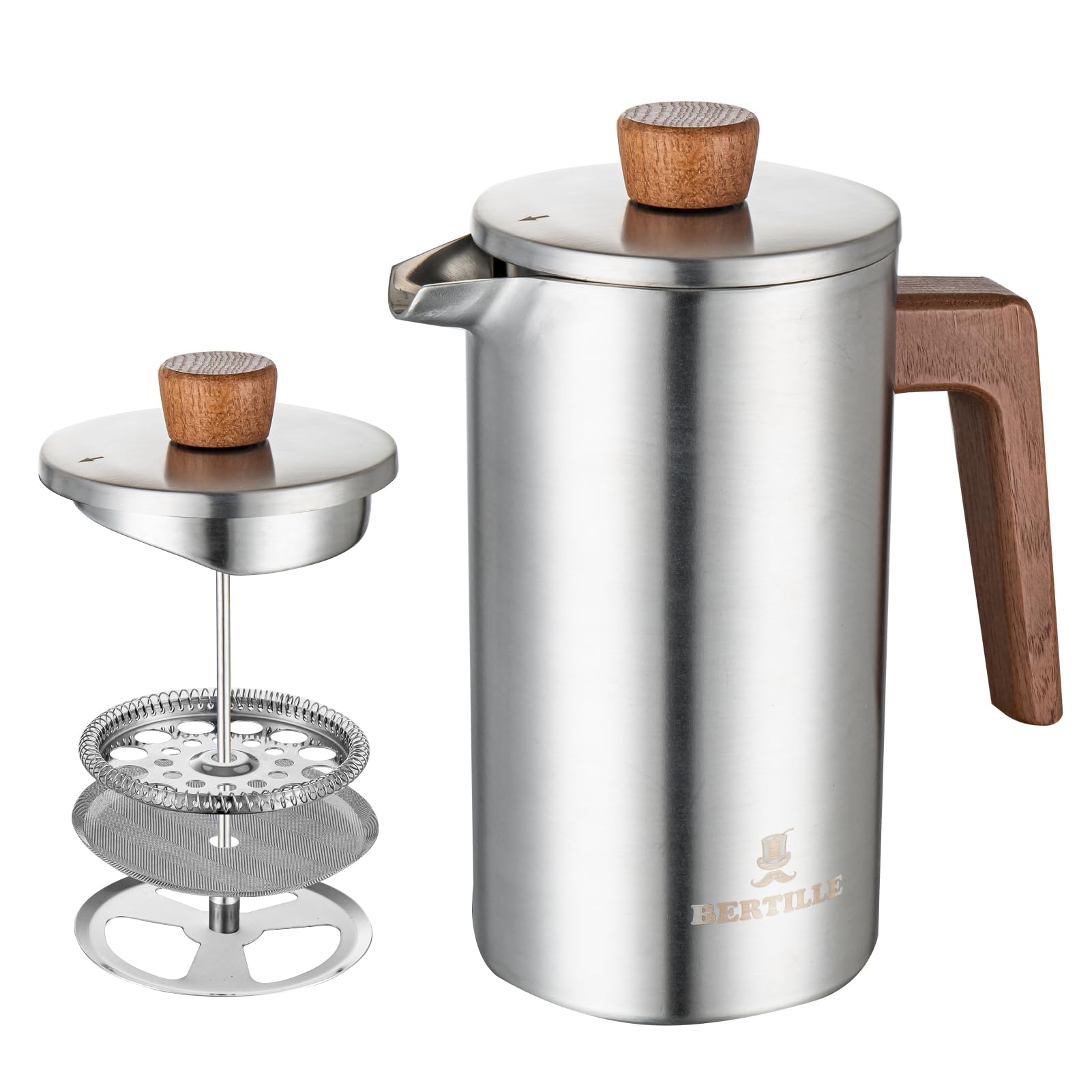 BERTILLE Cafetera de prensa francesa, cafetera de prensa francesa de acero inoxidable 304 de 34 onzas con mango de madera maciza,