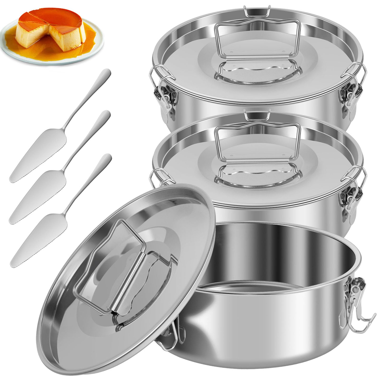 Paquete de 3 moldes de flan de acero inoxidable de 1.5 cuartos de galón, bandeja para flan con tapa y espátula, recipientes para o