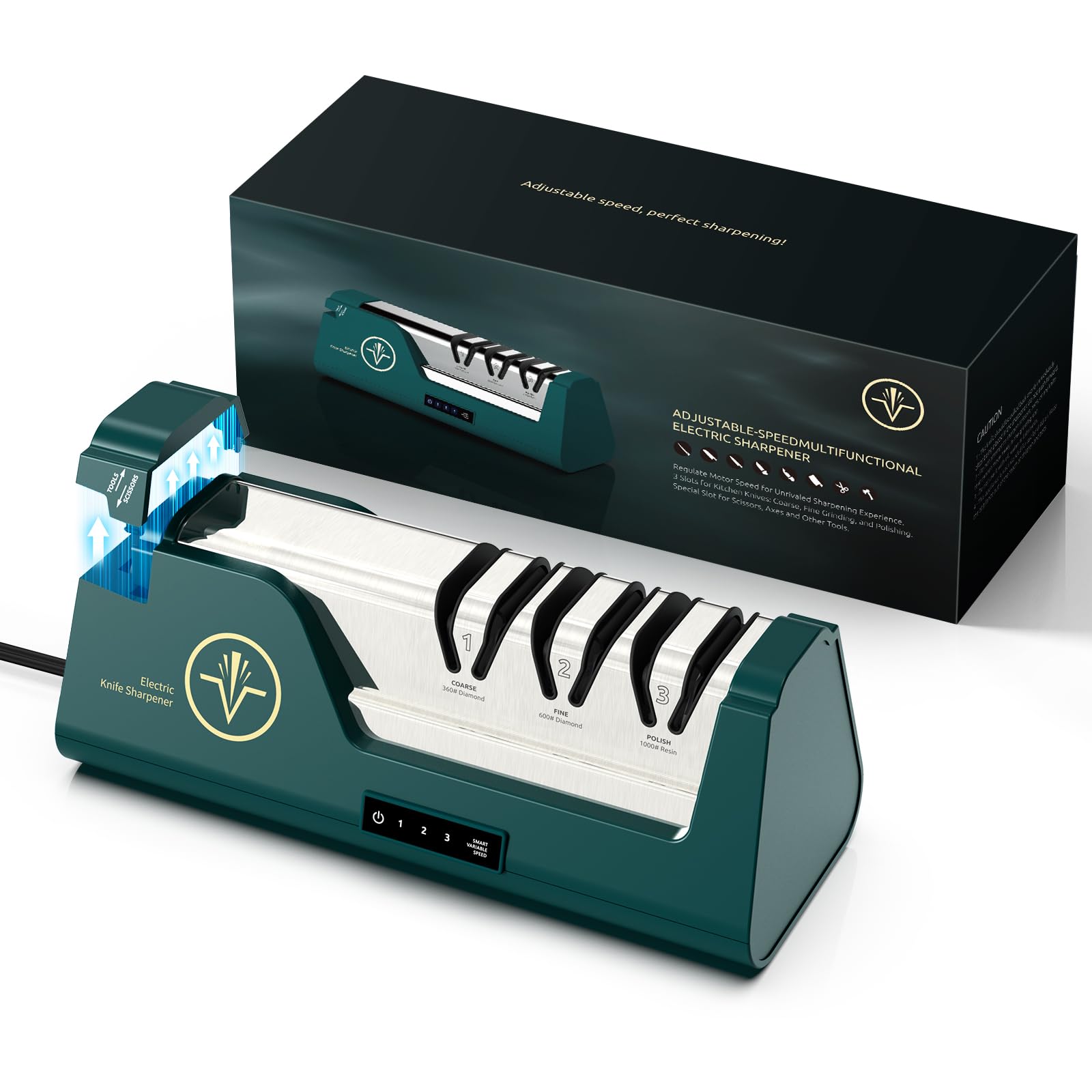 Afilador de cuchillos eléctrico con abrasivos 100% de diamante y guías de ángulo de precisión y variable de 3 velocidades y pantal