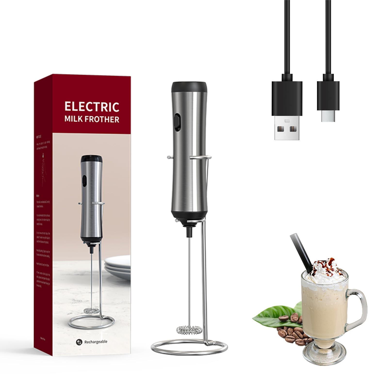 Delm Espumador de leche eléctrico USB de acero inoxidable, espumador para lattes, espumador de leche de mano para capuchino, frapp