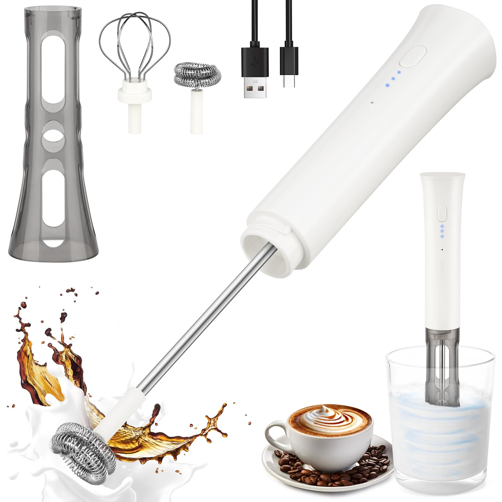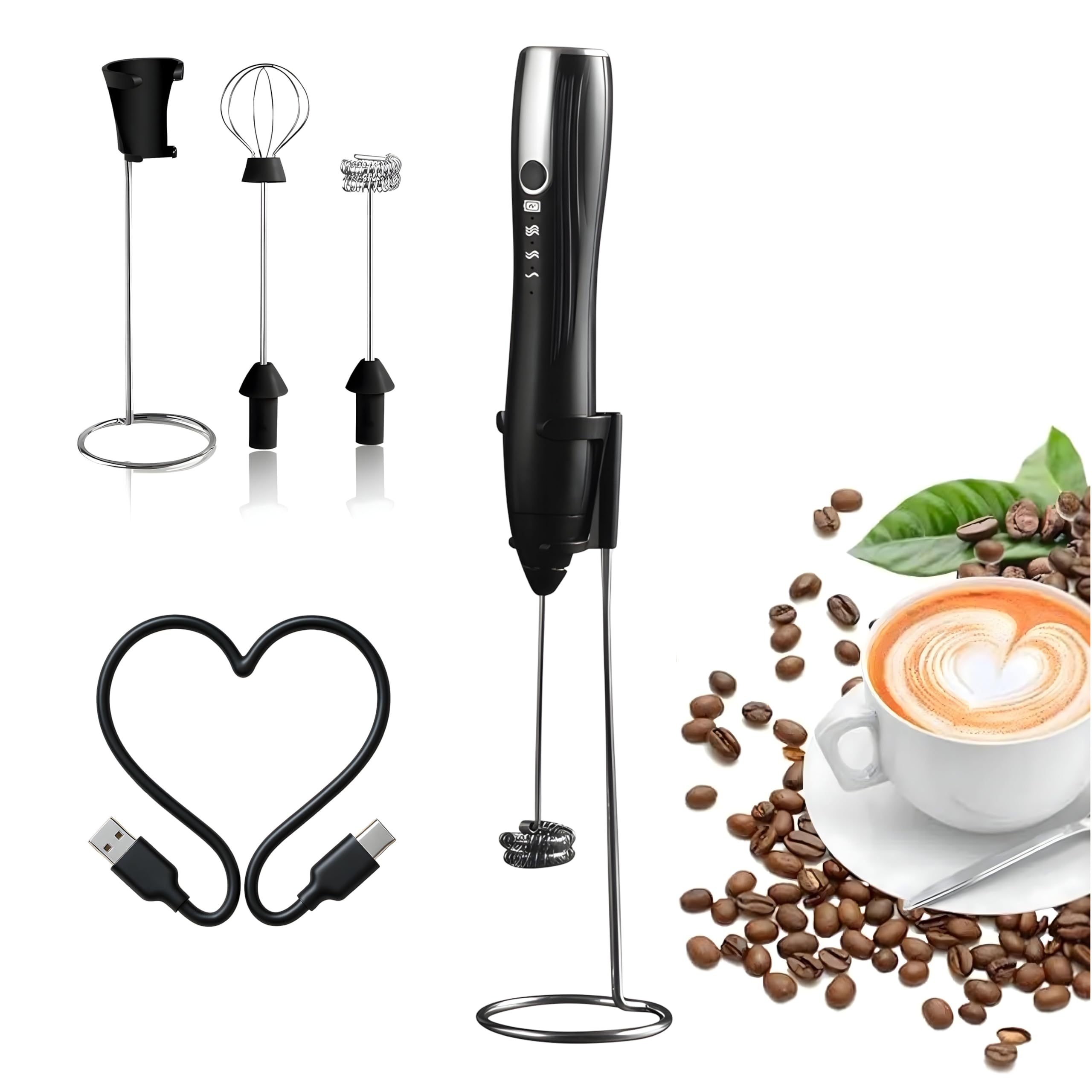 Varita espumadora de leche para café, mezclador de bebidas, espumador de mano, batidor eléctrico recargable con 5 cabezales, 2 vel