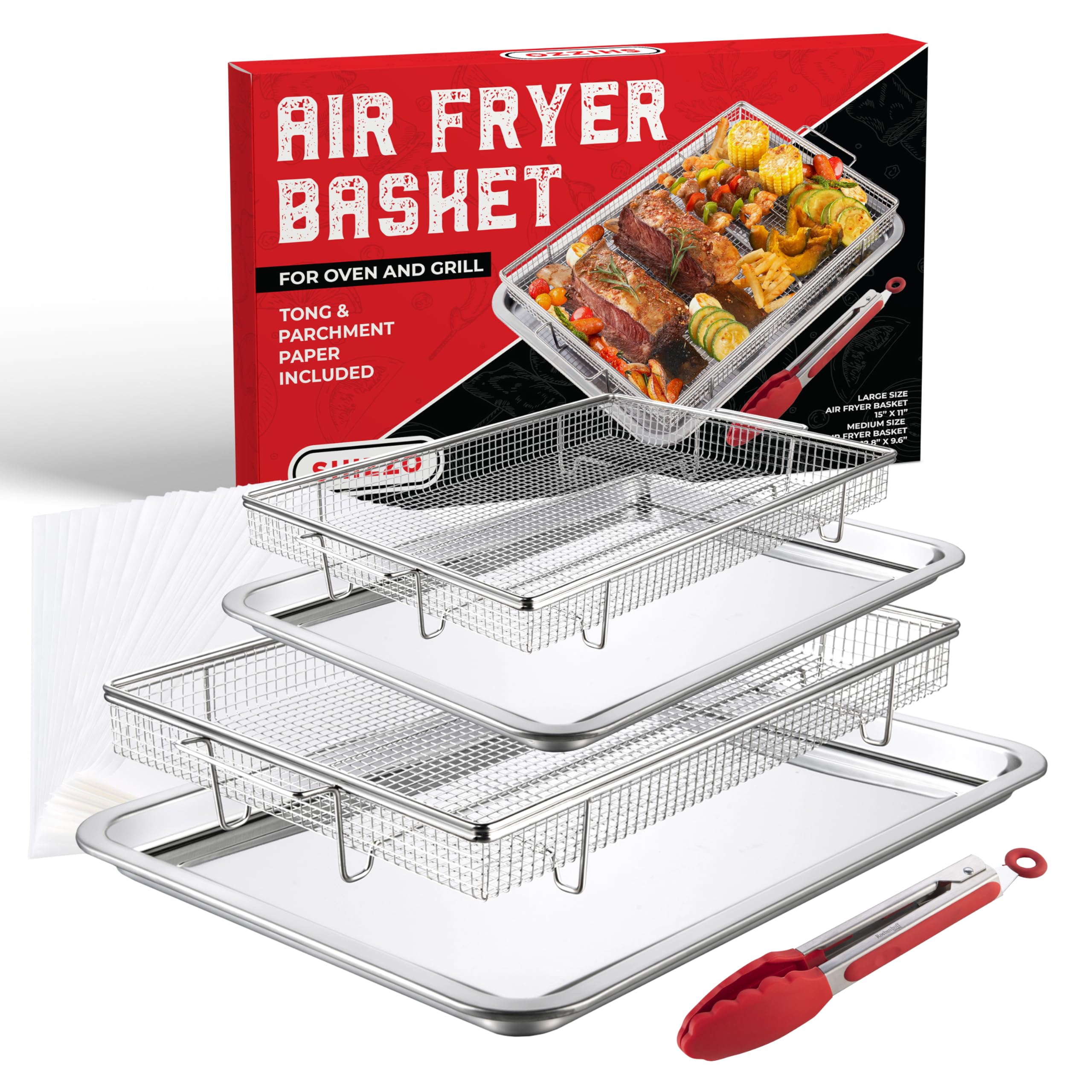 Cesta para freidora de aire para horno (juego de 2) – Bandeja de freidora de aire de acero inoxidable y sartén con 50 papeles perg