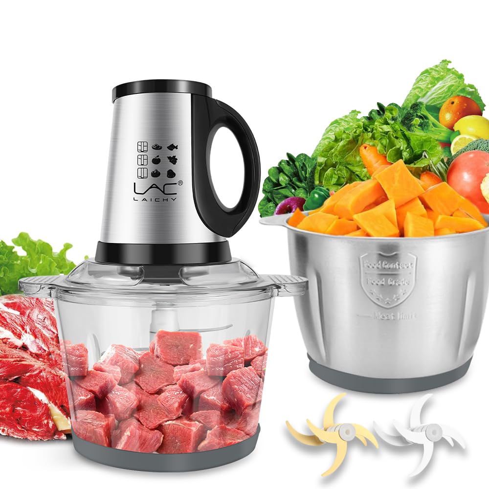 Procesadores de alimentos grandes, picadora de carne y verduras con un vaso y cuencos de acero inoxidable, 3 velocidades, 2 piezas